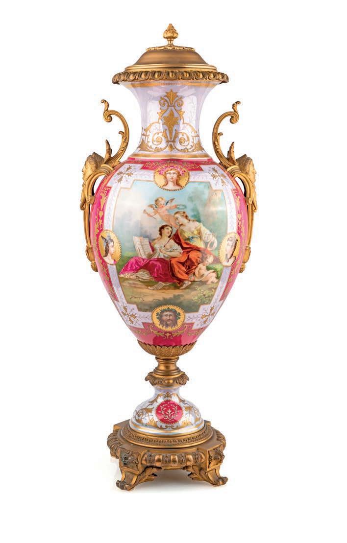GRANDE VASO IN PORCELLANA DI SÈVRES ROSSO PORPORA CON FIGURE MITOLOGICHE POLICROME E MONTATURA IN BRONZO DORATO, FRANCIA, XIX SECOLO facciata caratterizzata da una allegoria della musica alla maniera di François Boucher circondata da quattro medaglioni dorati con proflo perlinato, raffguranti ognuno un volto mitologico dipinto in vivace policromia (Mercurio, Cibele, Ercole e Bacco); la facciata posteriore è decorata da pannelli geometrici sovrapposti. Coperchio, anse e base in bronzo dorato. altezza cm 75