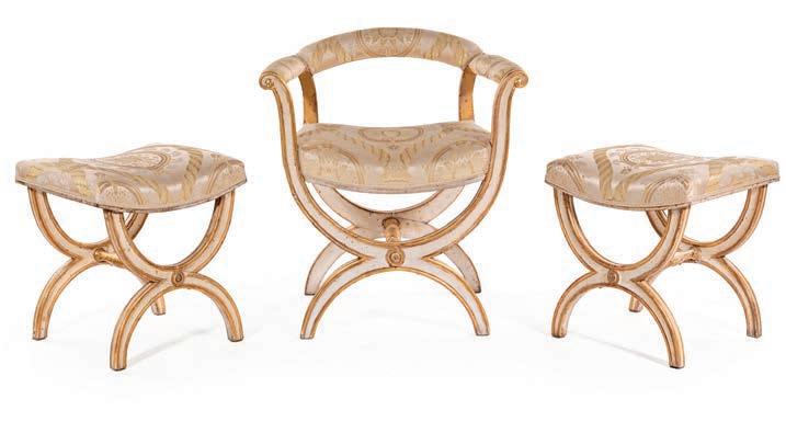 POLTRONA A FALDISTORIO E COPPIA DI SGABELLI