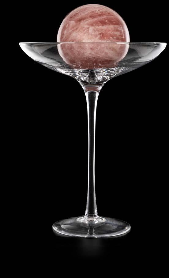 ALZATA IN VETRO INCOLORE CON SFERA IN MARMO ROSA coppa circolare su alto ed esile stelo liscio; piede a disco cm 40x31,5