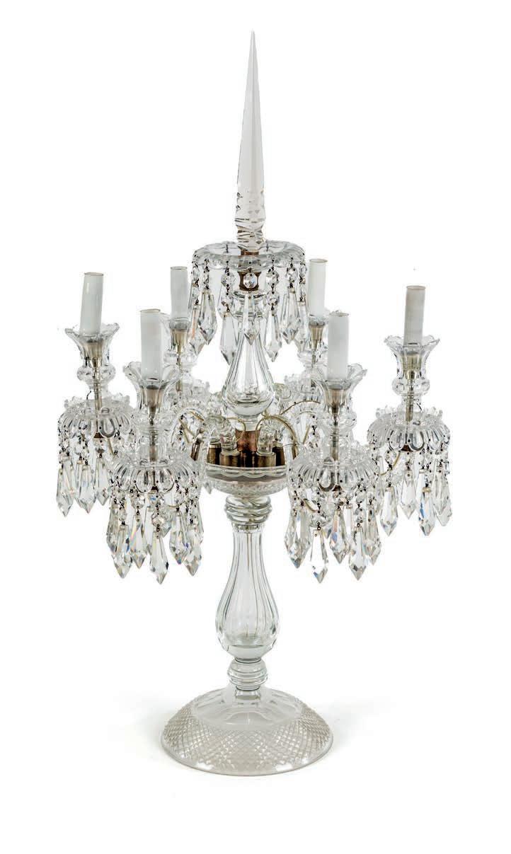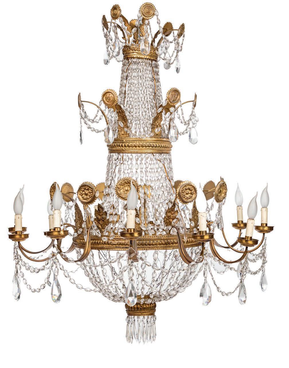 bracci arcuati disposti intorno la circonferenza dell’elemento portante percorso da perle e perline sbalzate; l’intera struttura è costituita da festoni con cristalli sfaccettati a sfera e a goccia riuniti sulla sommità ad anello guarnito da brevi rami di quercia con ghiande; ogni braccio è impreziosito da una placchetta circolare con corolla aggettante cm 130x110