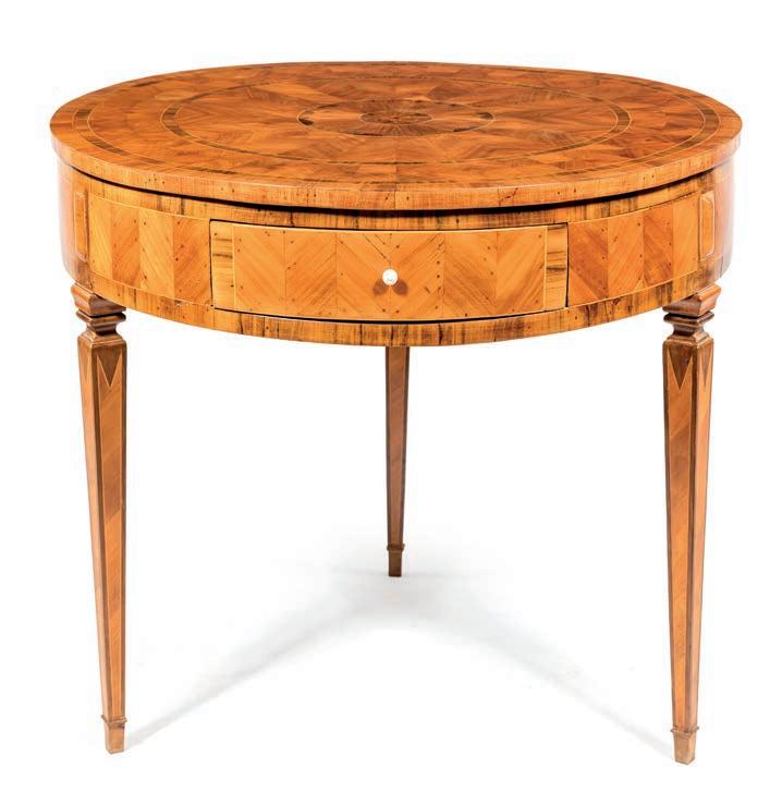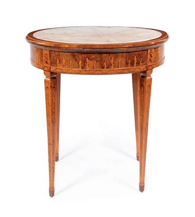 TAVOLINO OVALE LUIGI XVI con flettature disposte a creare riquadri geometrici; un cassetto nella fascia con apertura a scatto mediante un pulsante posto la fascia; all’interno un ripiano scorrevole rivestito in pelle e due tiretti, gambe rastremate cm 74x72x52