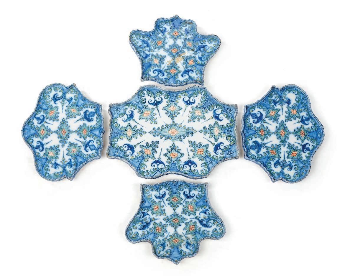 formato da un elemento centrale di maggiori dimensioni e da quattro elementi satelliti sagomati, concepiti per essere disposti simmetricamente sulla tavola. La forma mossa e lobata di ciascun pezzo, con profli ondulati e contorni spezzati, è decorato da composizioni vegetali dipinte in monocromia blu con con piccoli fori sparsi rossi, racemi e intrecci vegetali che si organizzano in composizioni simmetriche ma leggere, di ispirazione orientaleggiante. Lievi difetti cm 5x86x74