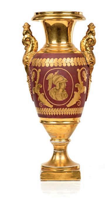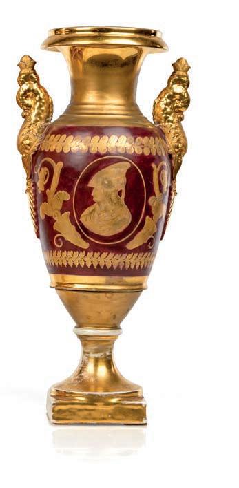 corpo ovoidale e collo svasato, decorati su fondo rosso porpora con ricco apparato ornamentale in oro zecchino con profli classici contrapposti cui corrispondono coppe sulla facciata posteriore. Motivi a cartigli, volute, elementi vegetali e cornucopie scandiscono la superfcie, creando un raffnato contrasto tra il colore di fondo e la brillantezza della doratura. Anse plastiche emergenti da palmetta in rilievo altezza cm 39,5