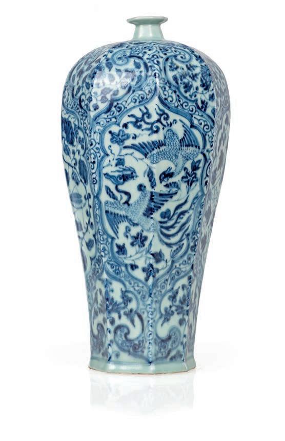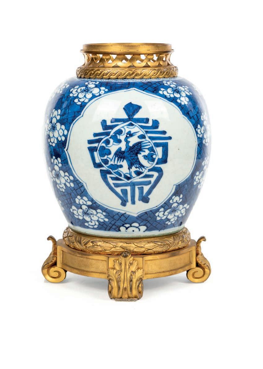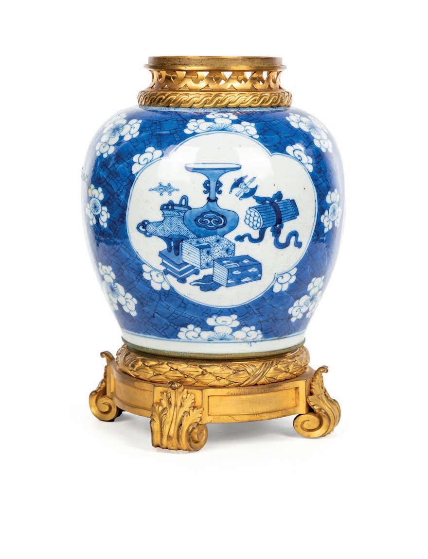 VASO DA ZENZERO IN PORCELLANA BIANCA E BLU, CINA, XVIII SECOLO, MONTATO IN BRONZO DORATO, FRANCIA, XIX SECOLO corpo panciuto decorato a fori su fondo blu, caratterizzato da una riserva quadrilobata ad includere oggetti simbolici della tradizione orientale. Mancante di coperchio, reca orlo superiore in bronzo dorato con breve collo traforato ad onde e poggia su una base cilindrica sostenuta da tre piedi a mensola terminante a ricciolo, sottolineata da rilievo fogliaceo altezza cm 30
