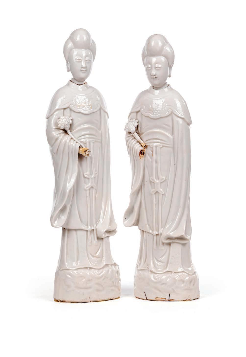 DUE FIGURE DI GUANYIN IN PORCELLANA BLANC DE CHINE, DEHUA, DINASTIA QING, EPOCA KANGXI, XVIII SECOLO raffgurate in piedi, i capelli raccolti trattenuti in chignons impreziositi da fermagli minuziosamente resi, abbigliate con lunga tunica drappeggiata ed ampie maniche a cascata a coprire le mani; nella destra entrambe trattengono uno scettro ruyi. Lievi difetti di cottura e piccole mancanze altezza cm 44 e cm 45