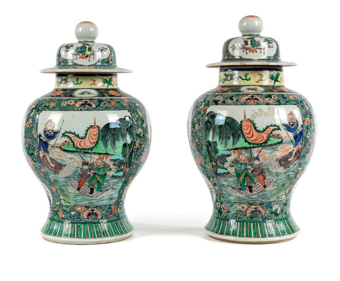 caratterizzati da ftta decorazione a motivi foreali nei toni della Famiglia Verde in cui emergono riquadri sagomati con scene animate da personaggi su zattere in acque agitate e composizioni foreali dipinti in modo specchiato per porre i due vasi “vis à vis”. Coperchio a cupolino sormontato da una sfera. Marchio doppio cerchio in blu sotto la base. altezza cm 46