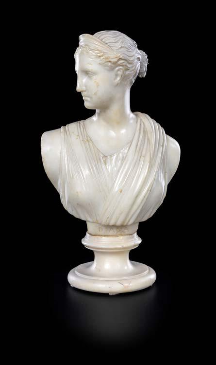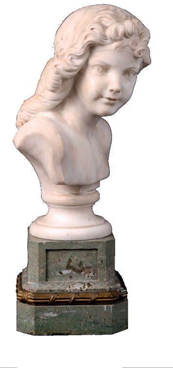 marmo bianco il volto rivolto verso la spalla destra, i capelli ondulati idealmente mossi dal vento ed un ricciolo ricadente sulla fronte. Piedistallo a rocchetto su base squadrata in marmo grigio. Reca incisa a verso della spalla sinistra le iniziali “P.G.” non identifcate. Si veda per confronto il Cupido di Tassaert esposto al Bode-Museum di Berlino, Germania altezza cm 62