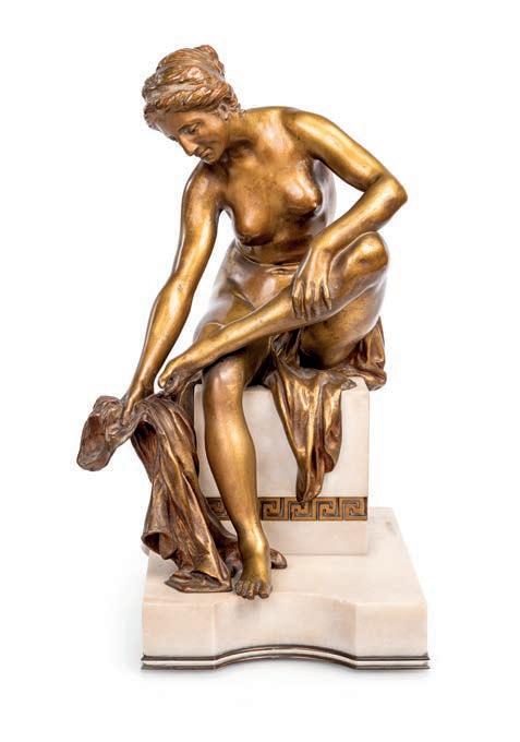 bronzo a patina dorata, su base in marmo bianco con fregio a greca Firmata “J. Labatut” sulla base. La scultura raffgura una giovane donna nuda, colta in un momento intimo e quotidiano, seduta su un blocco in marmo bianco. Il corpo è leggermente inclinato in avanti; la gamba sinistra piegata poggia sul ginocchio della gamba destra che scende naturalmente; con una mano la fgura trattiene un drappo che scivola verso il basso. La base marmorea decorata da una cornice a greca, richiama modelli classici. cm 39x18,5x25,5