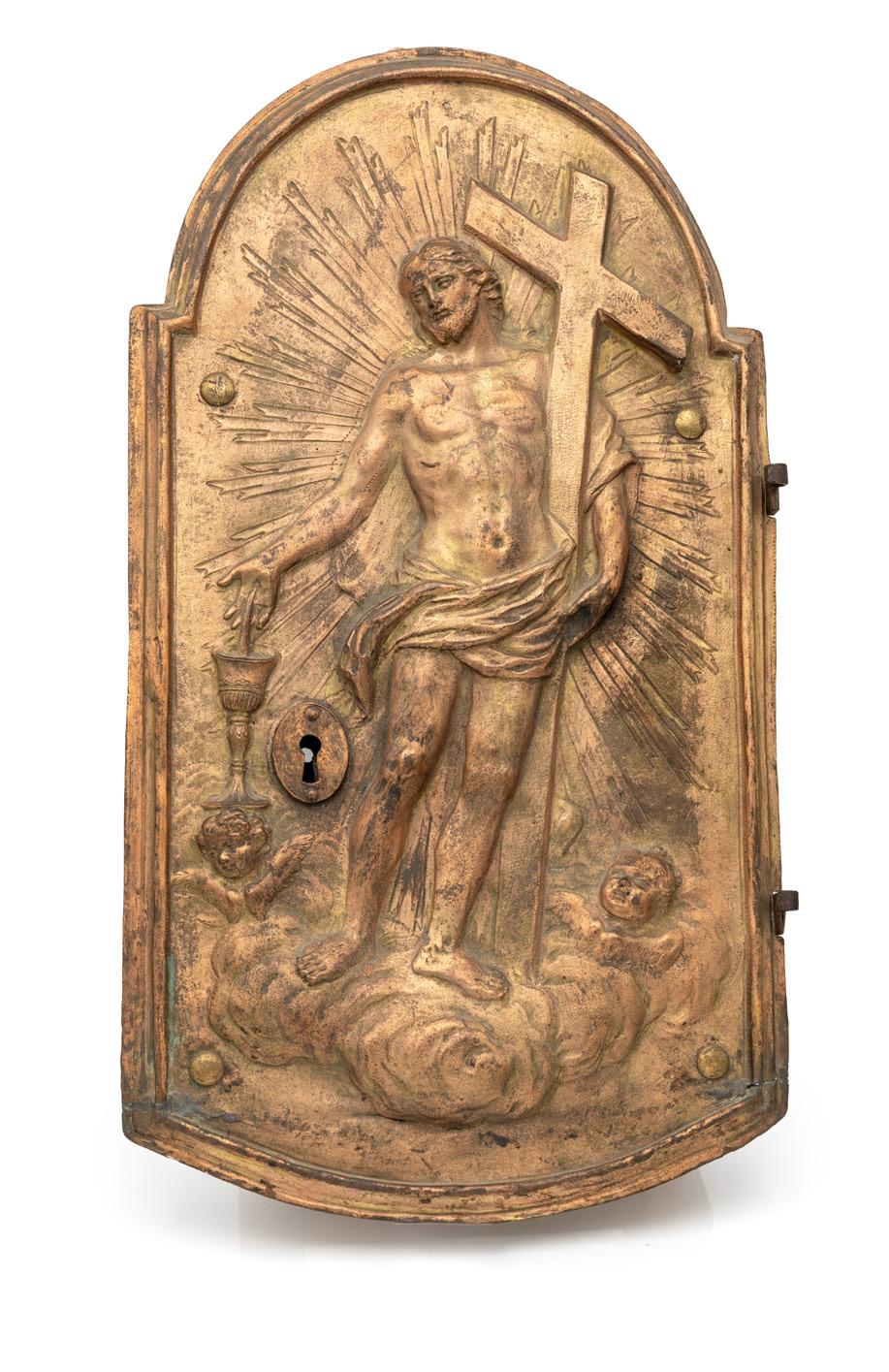 SPORTELLO DI TABERNACOLO IN METALLO SBALZATO E DORATO, XIX SECOLO di forma centinata è decorato da fgura di Cristo risorto che indica con la mano destra il calice col proprio sangue e sostiene la croce con la mano sinistra; ai suoi piedi cumoli nebulosi con teste di cherubino; dotato di serratura funzionale cm 39x21