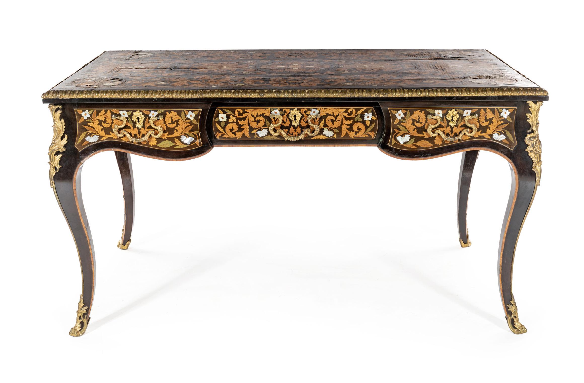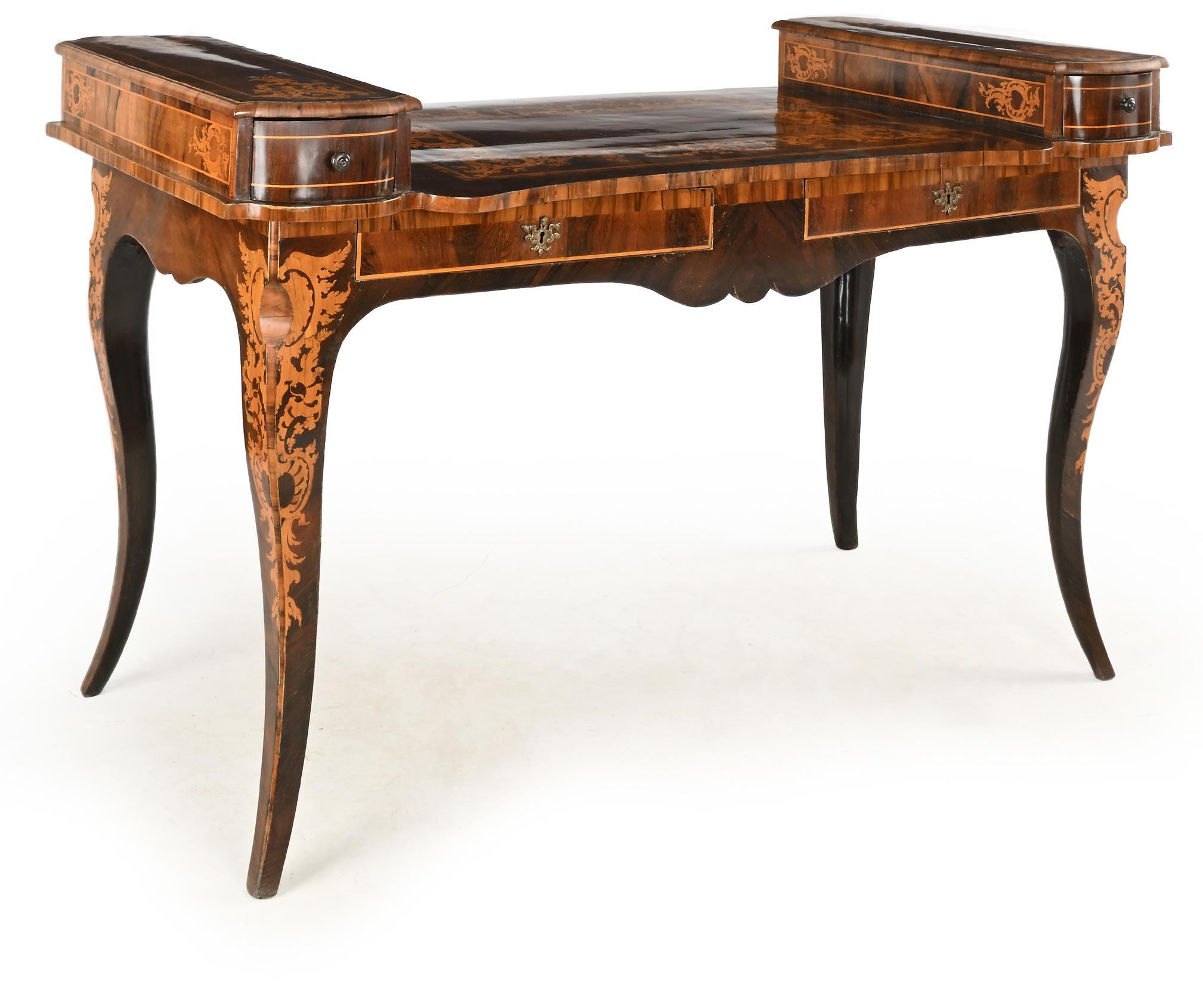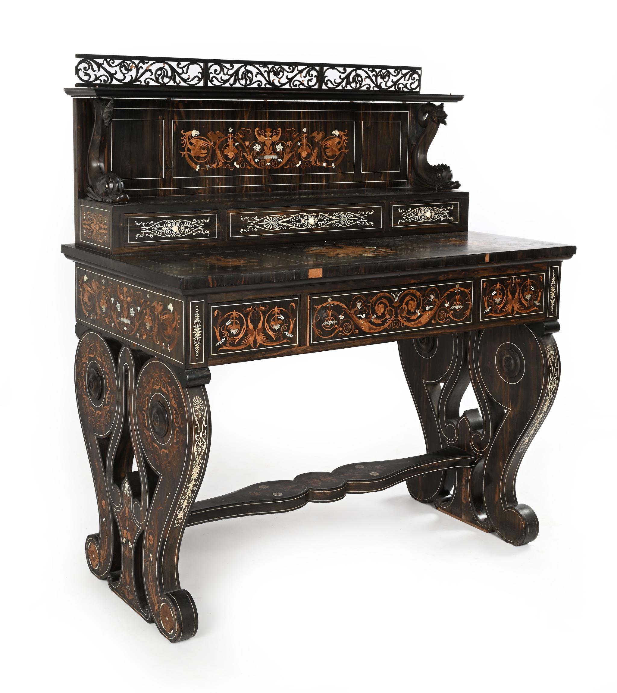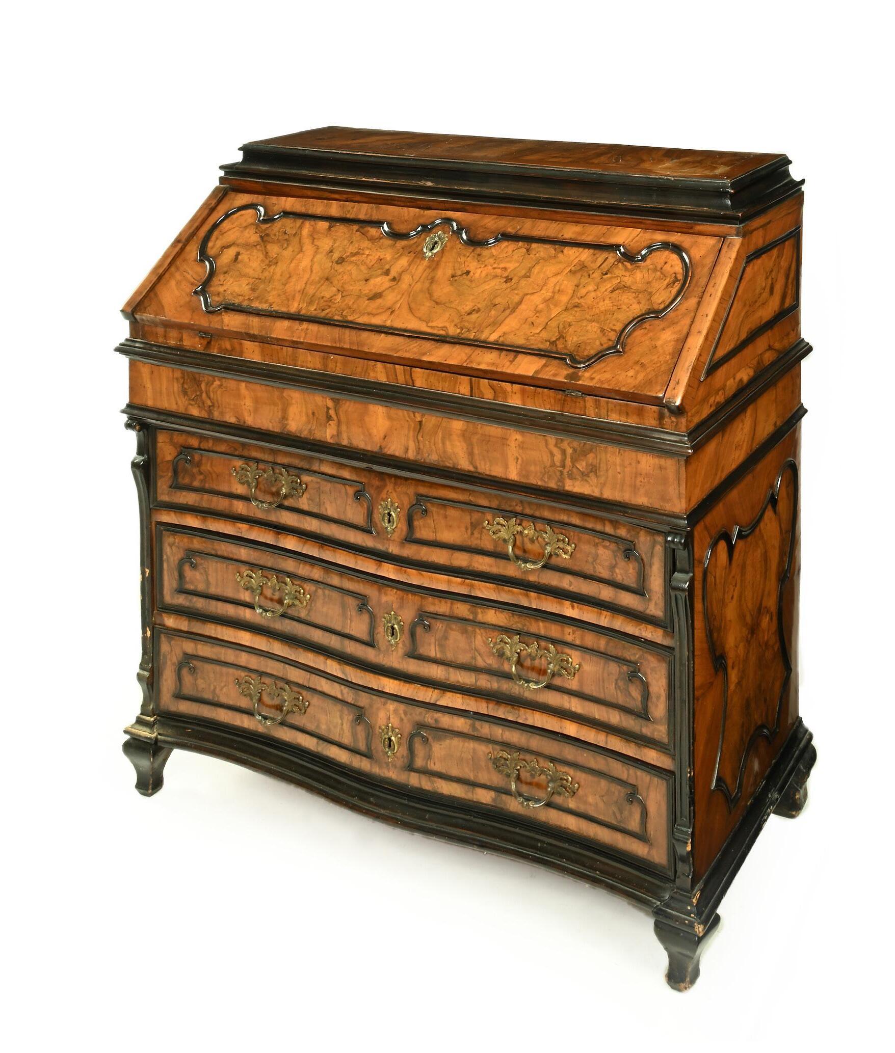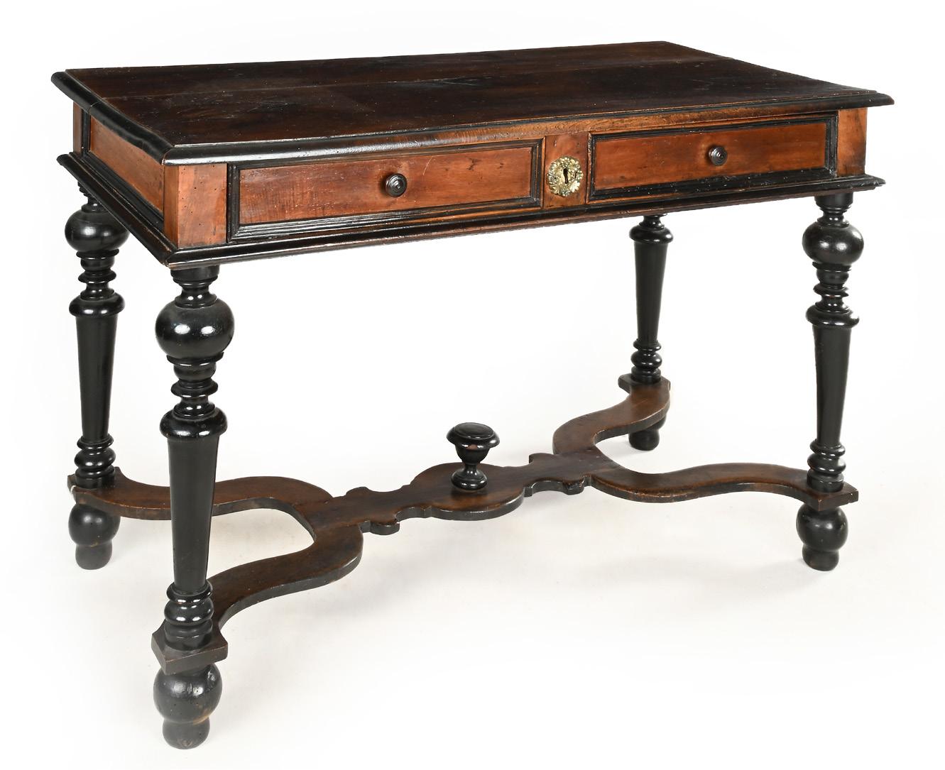 piano rettangolare con ciglio spiovente ebanizzato, due cassetti in linea nella fascia, gambe a balaustro riunite da crociera sormontata da una trottola.