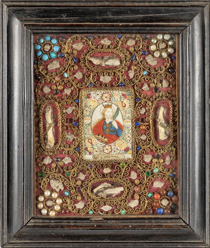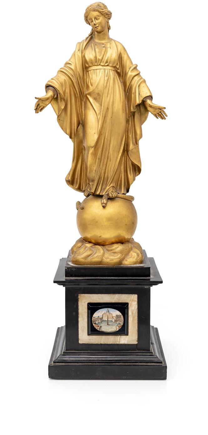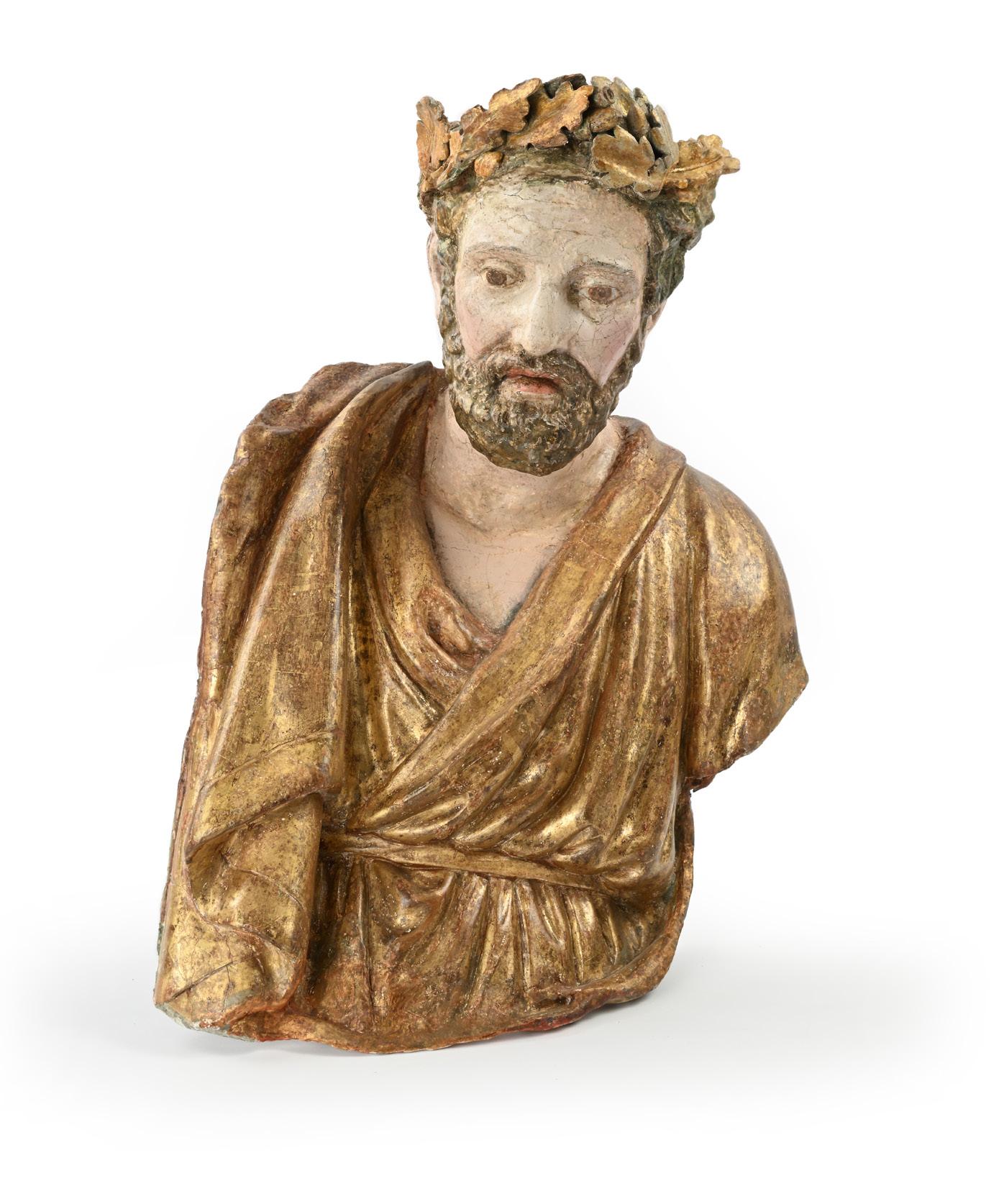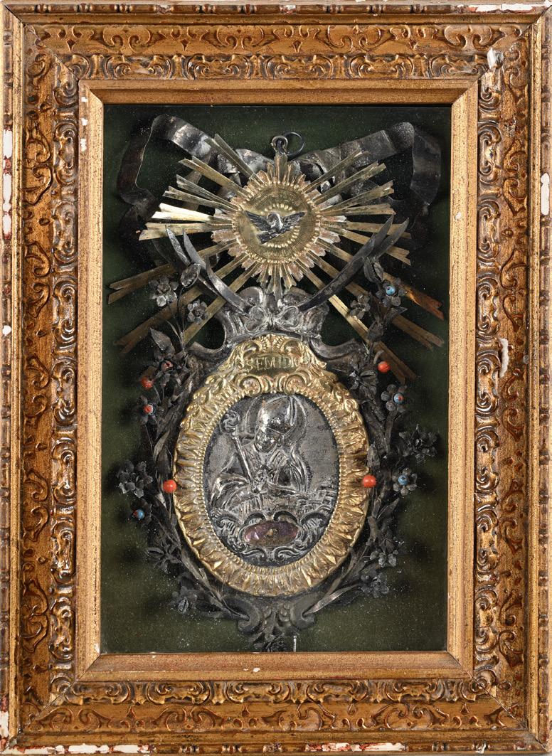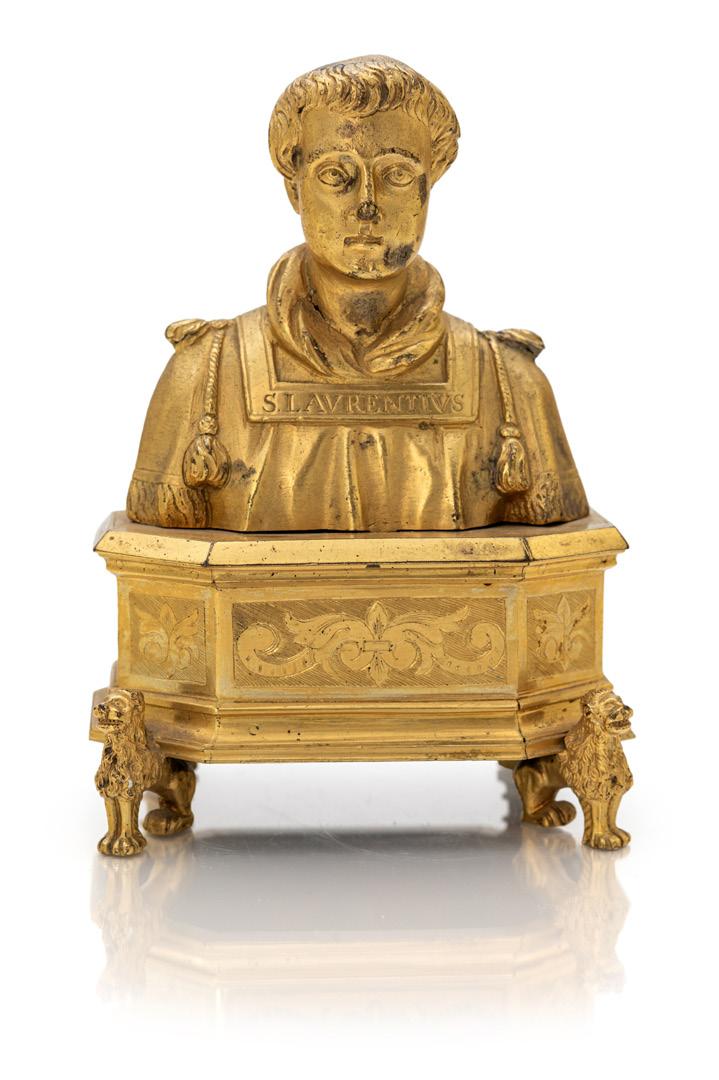 PICCOLO BUSTO RELIQUIARIO DI SAN LORENZO IN BRONZO DORATO, XVII SECOLO identifcabile dall’iscrizione “S. Laurentius” incisa sul petto, poggiante su base poliedrica sorretta anteriormente da fgure zoomorfe e nella parte posteriore da pilastri squadrati; reca una piccola apertura sotto la base cm 13,5 x 10 x 6,5