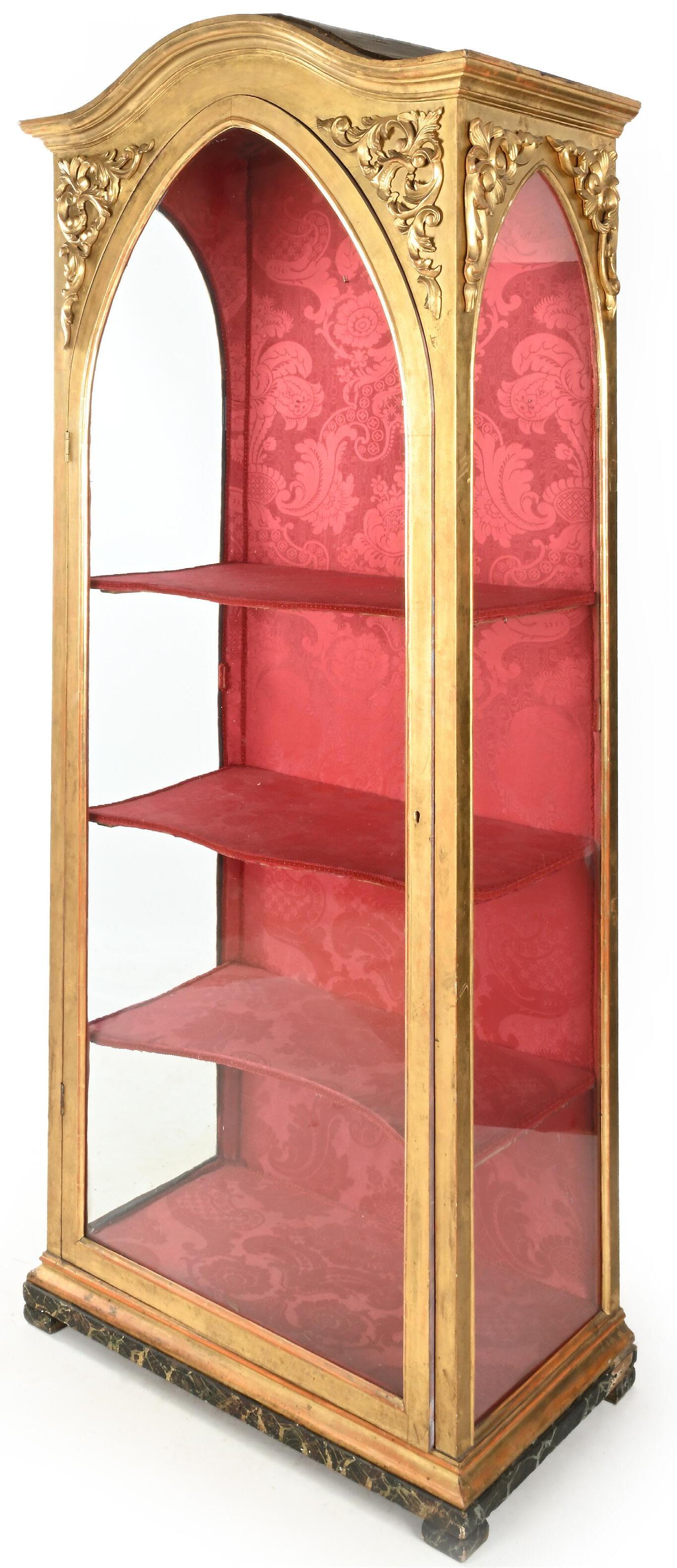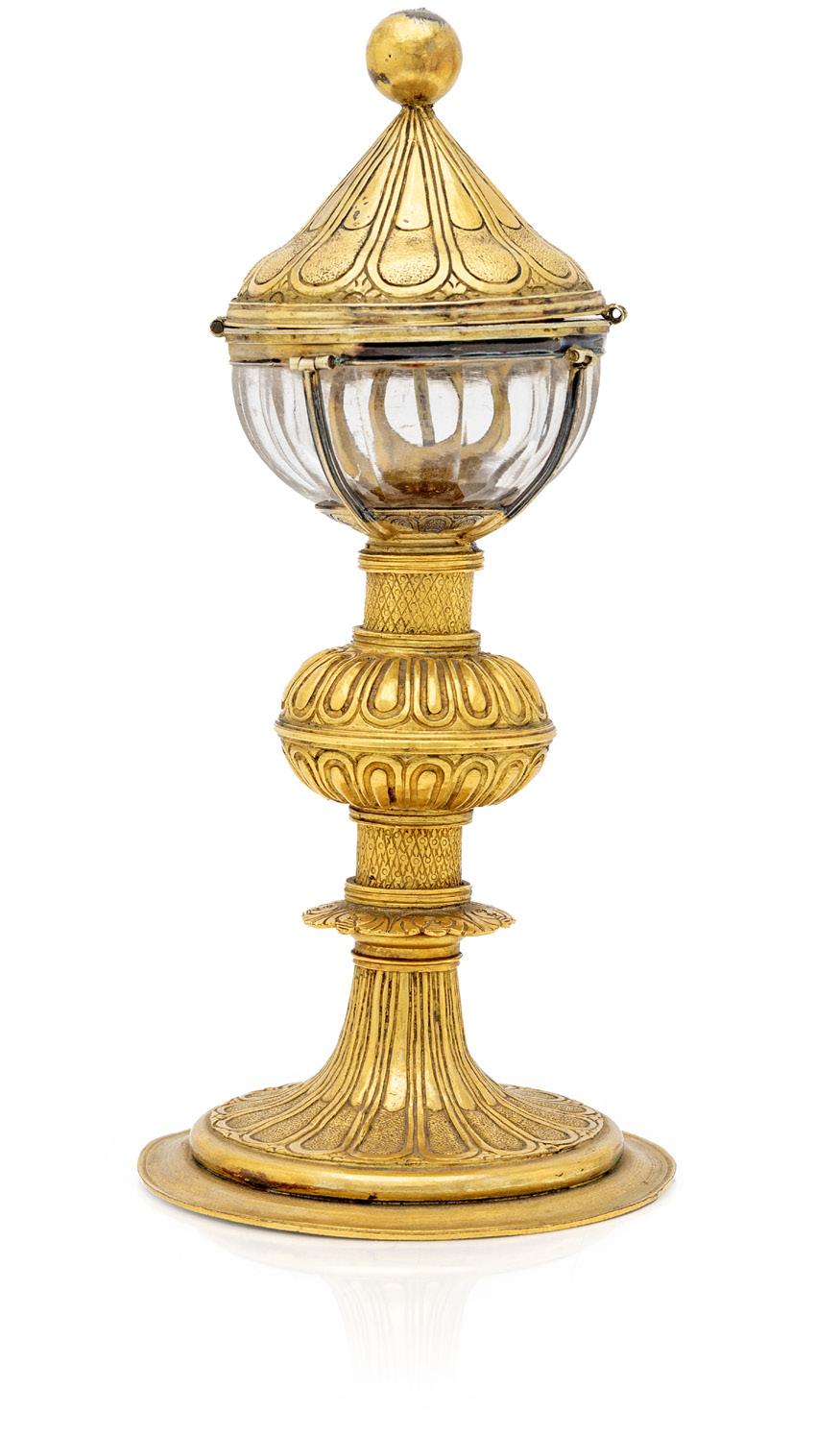 PICCOLO OSTENSORIO IN RAME DORATO, XVIII SECOLO con coppa in vetro (rotta) e sostegno interno per l’esposizione dell’ostia consacrata; coperchio a cupolino incernierato sormontato da una piccola croce dissaldata; stelo composito inciso con grande nodo baccellato e piede circolare altezza cm 21,5