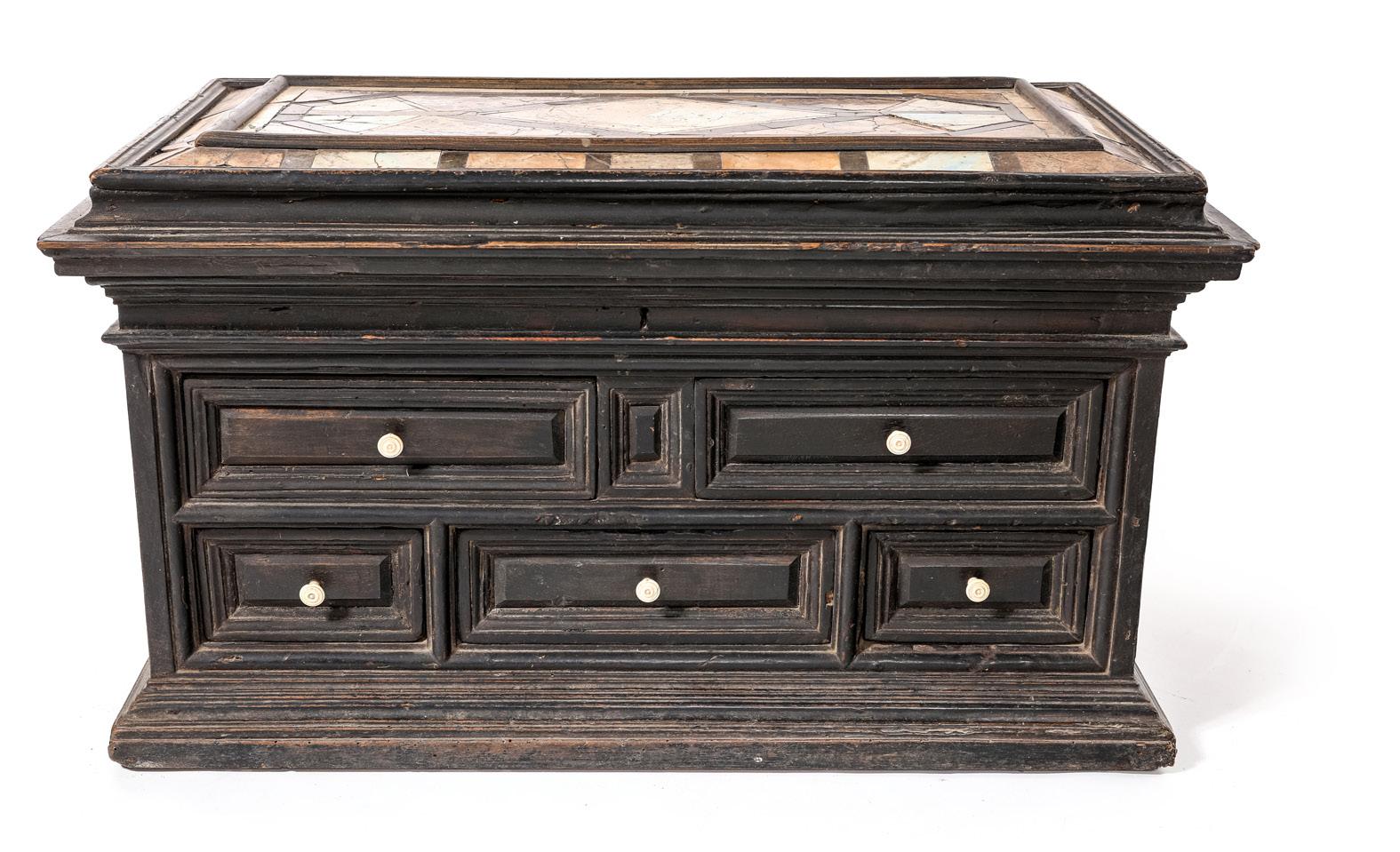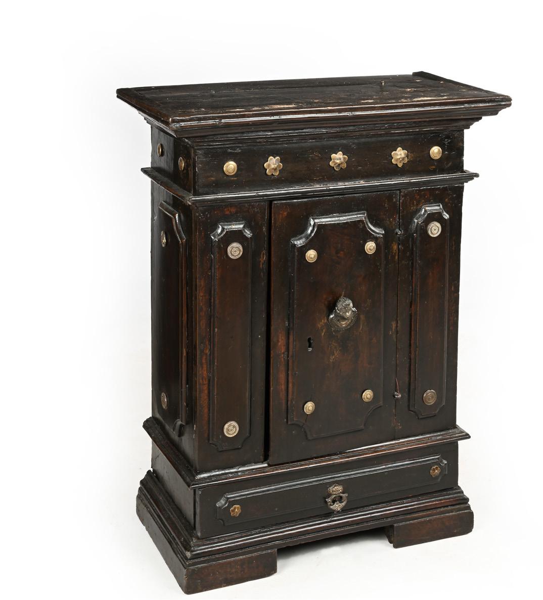 CREDENZINO IN LEGNO DIPINTO CON BORCHIE E TESTINA IN BRONZO, BOLOGNA, XVII SECOLO