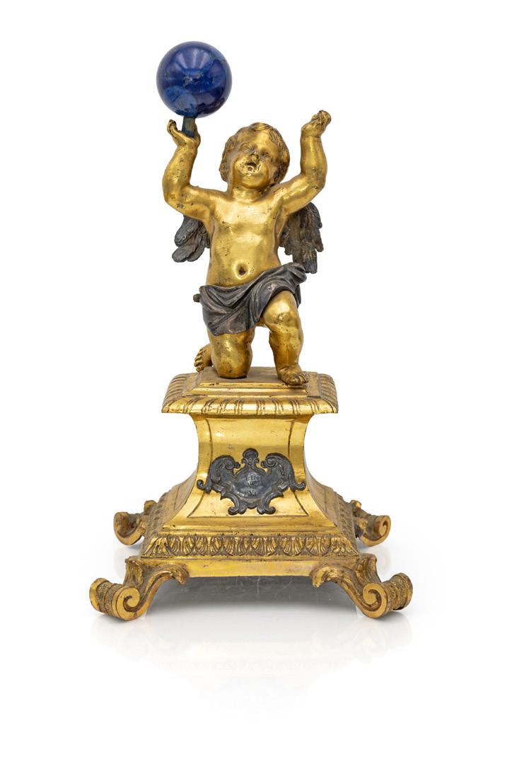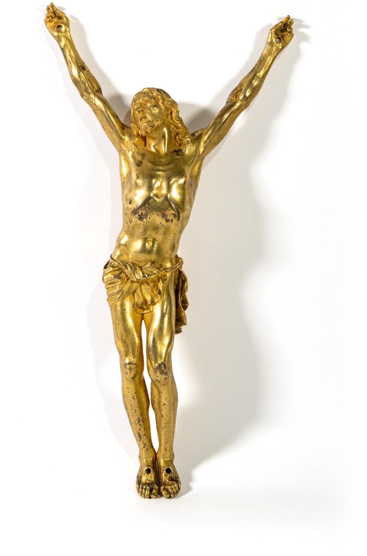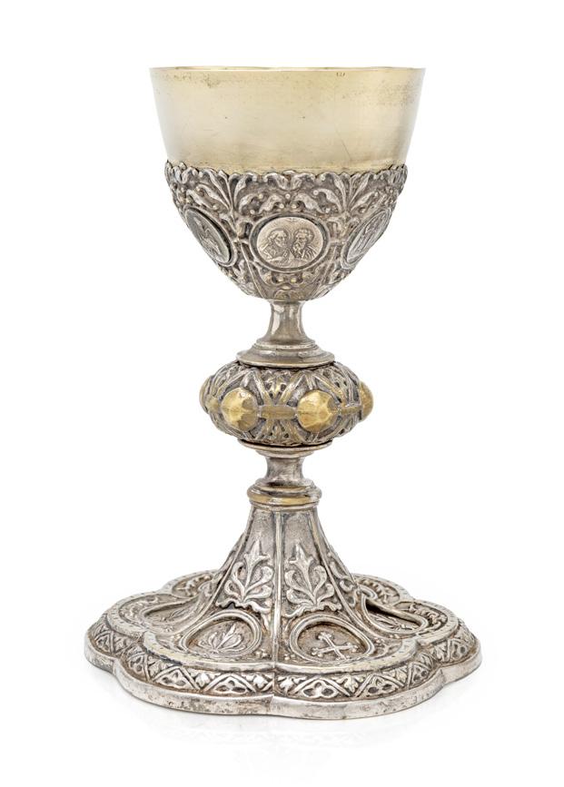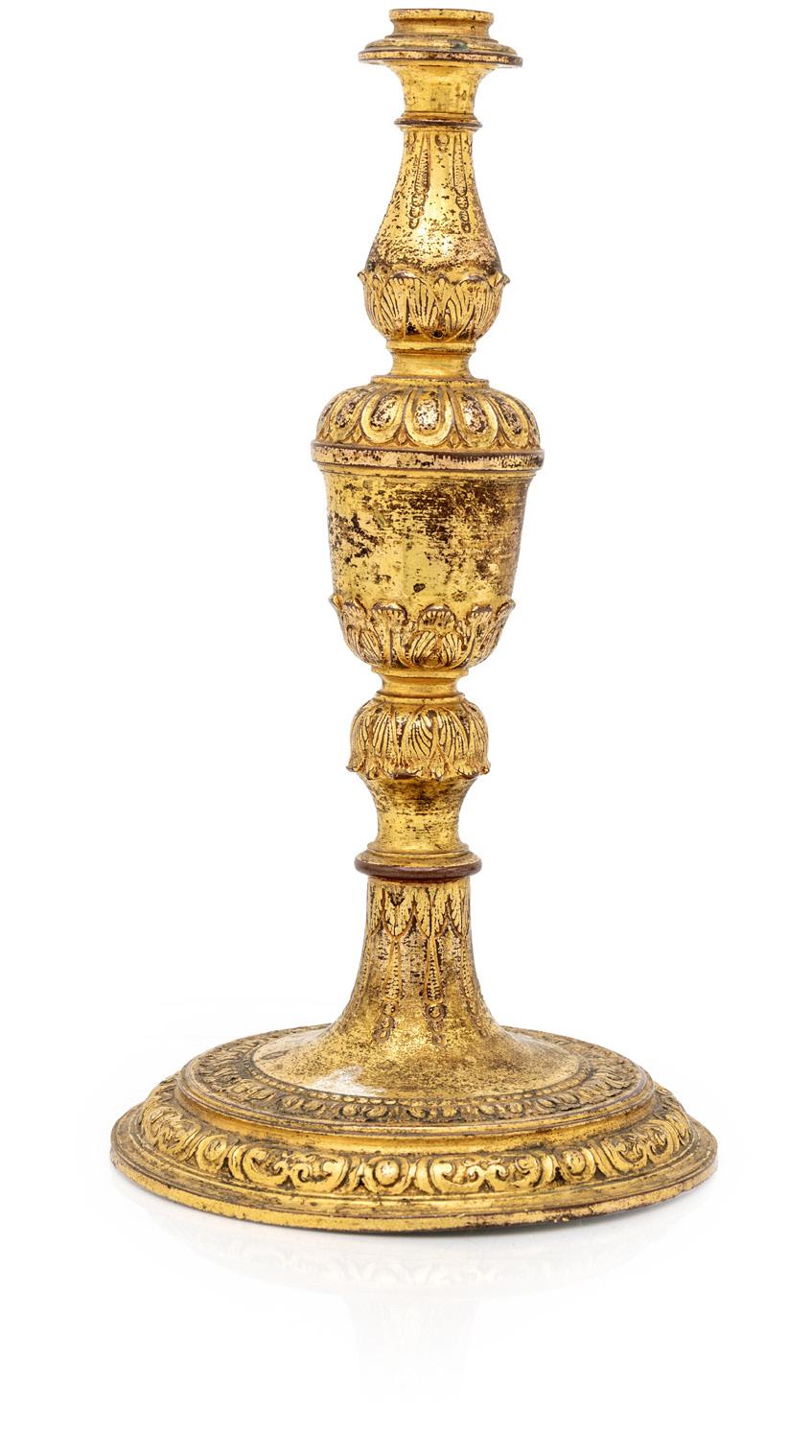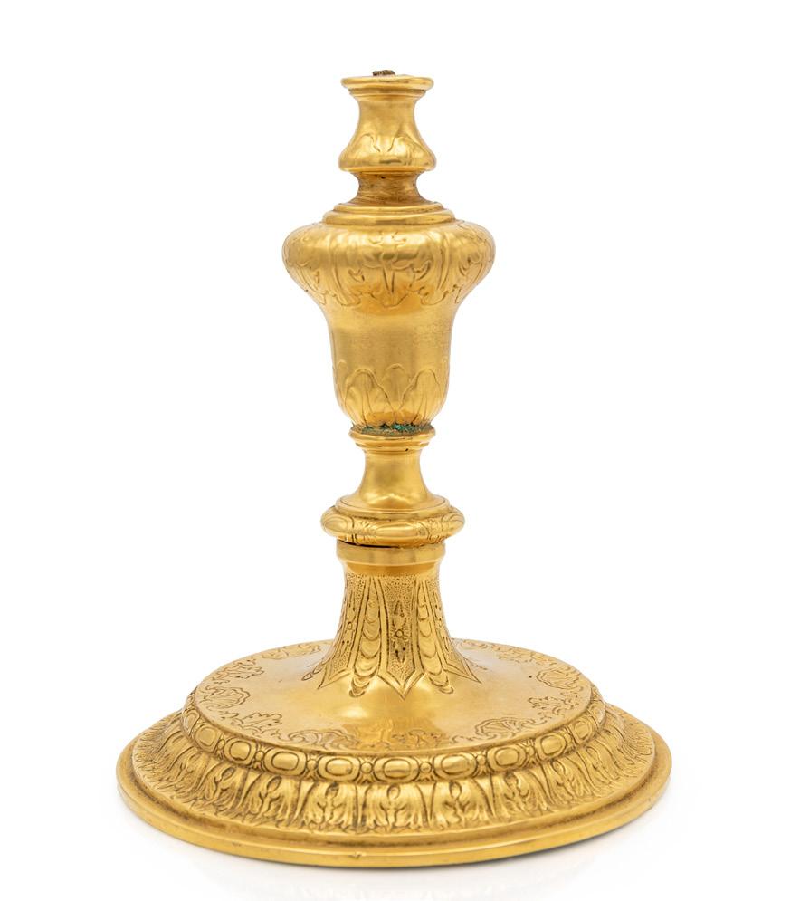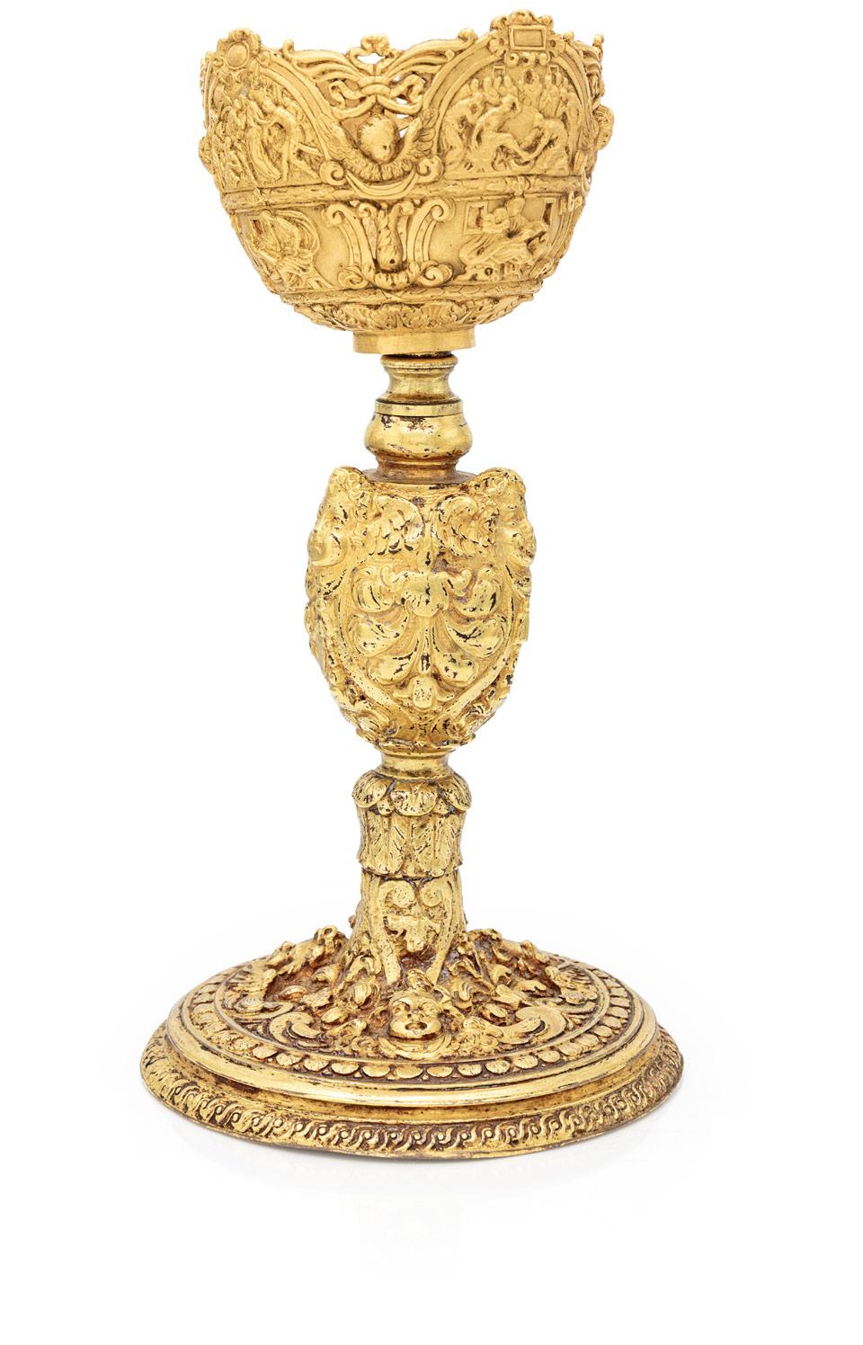 CALICE LITURGICO IN BRONZO DORATO, XVII SECOLO caratterizzato da ricca e minuziosa decorazione in rilievo composta da motivi fusi e cesellati. Sottocoppa scandita da due ordini di decorazione; nella parte superiore quattro lunette con i momenti della cattura di Cristo (ultima cena, lavanda dei piedi, orazione nell’orto di Getsemani e cattura di Cristo), alternate a teste di cherubino e motivi traforati di congiunzione; nel registro inferiore sono raffgurati i quattro evangelisti entro cartigli. Nodo con cherubini e palmette, elementi decorativi ripresi con varianti sul piede circolare. Sotto il piede un rosone e data incisa 1692 cm 21