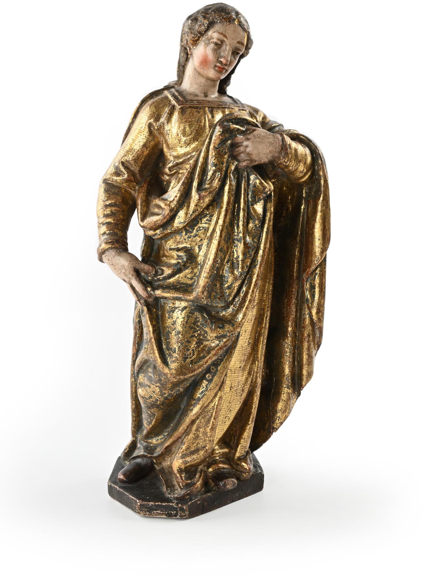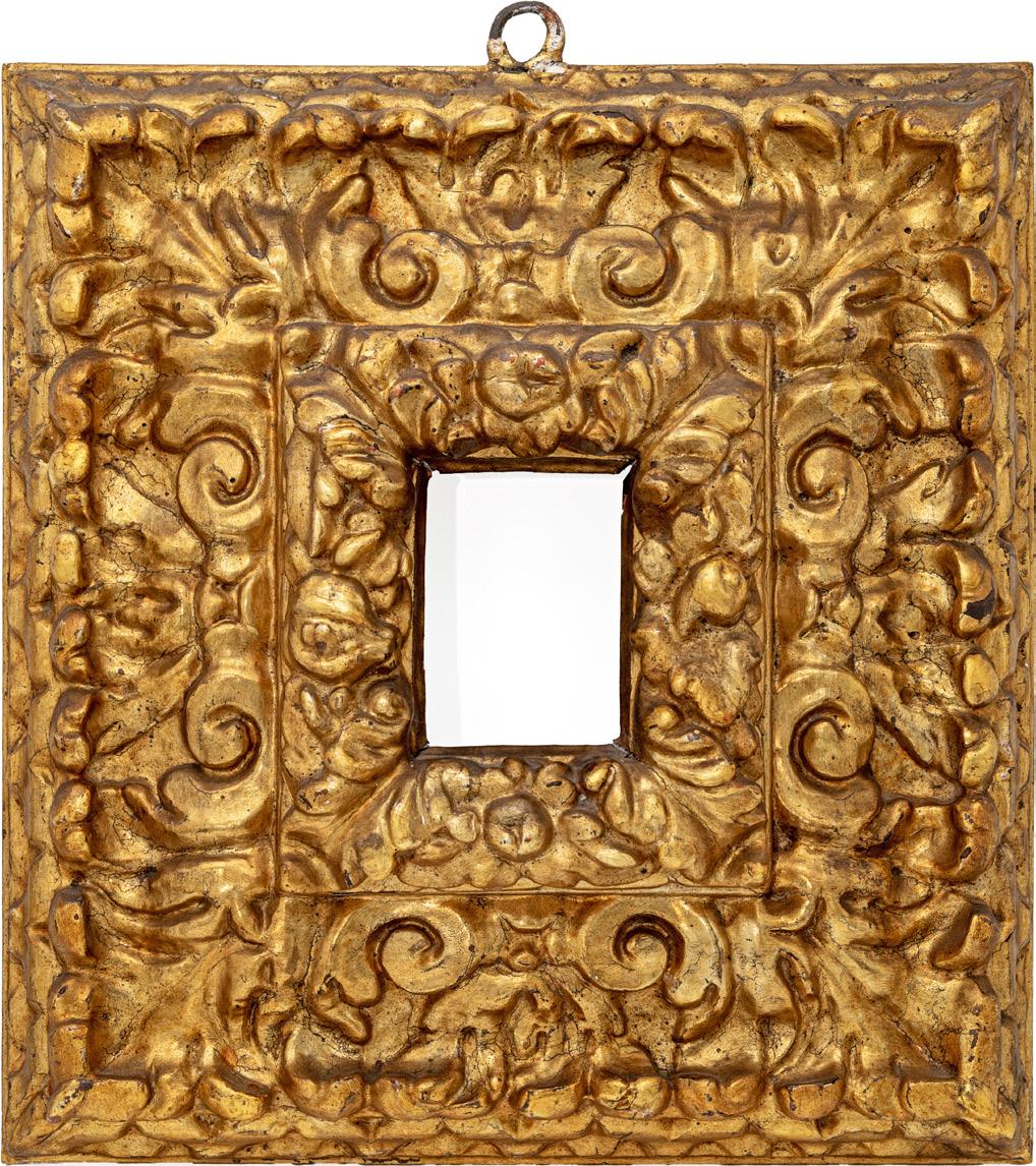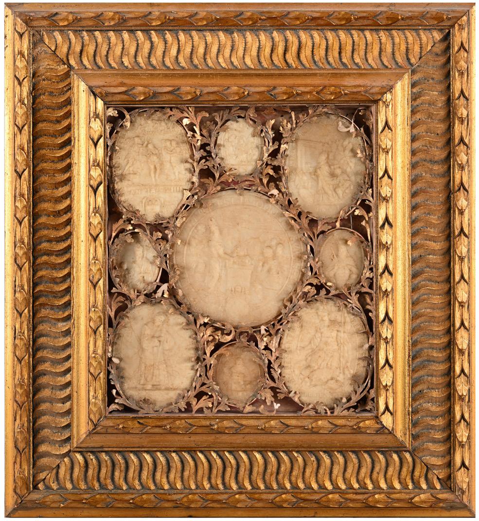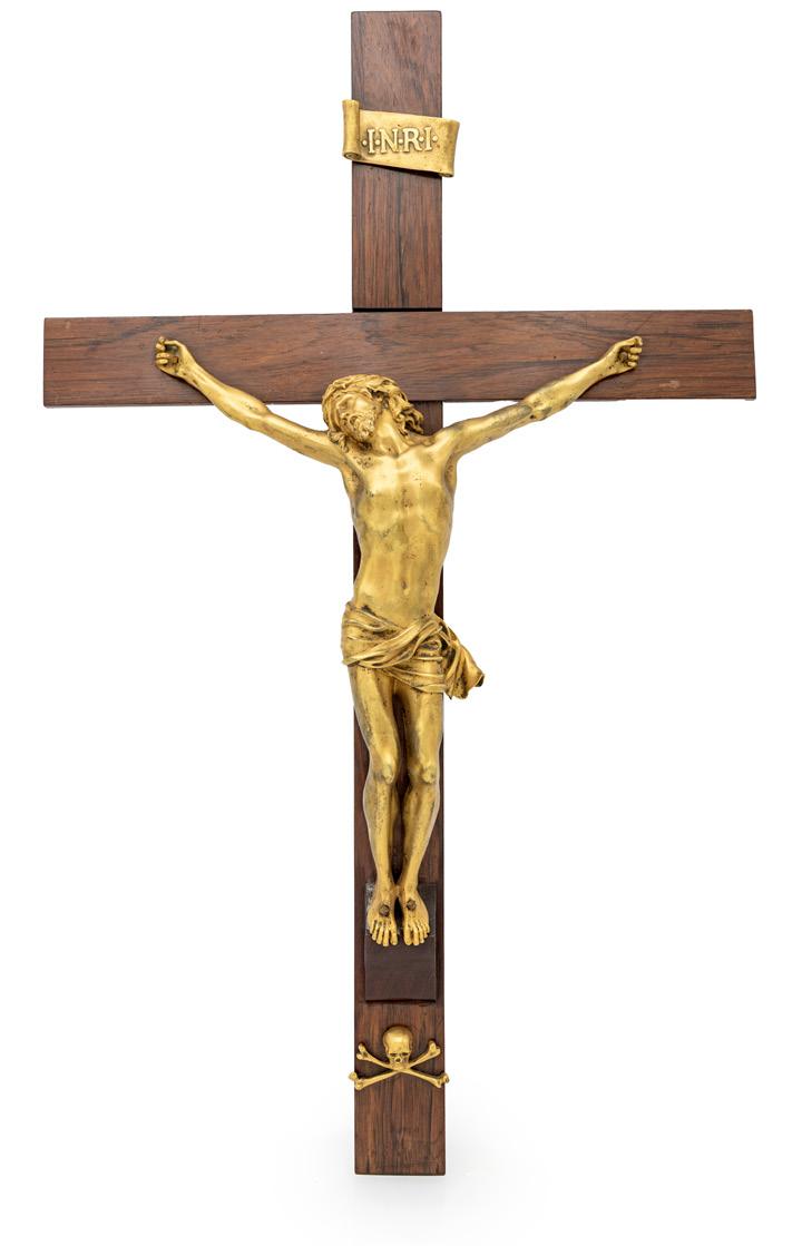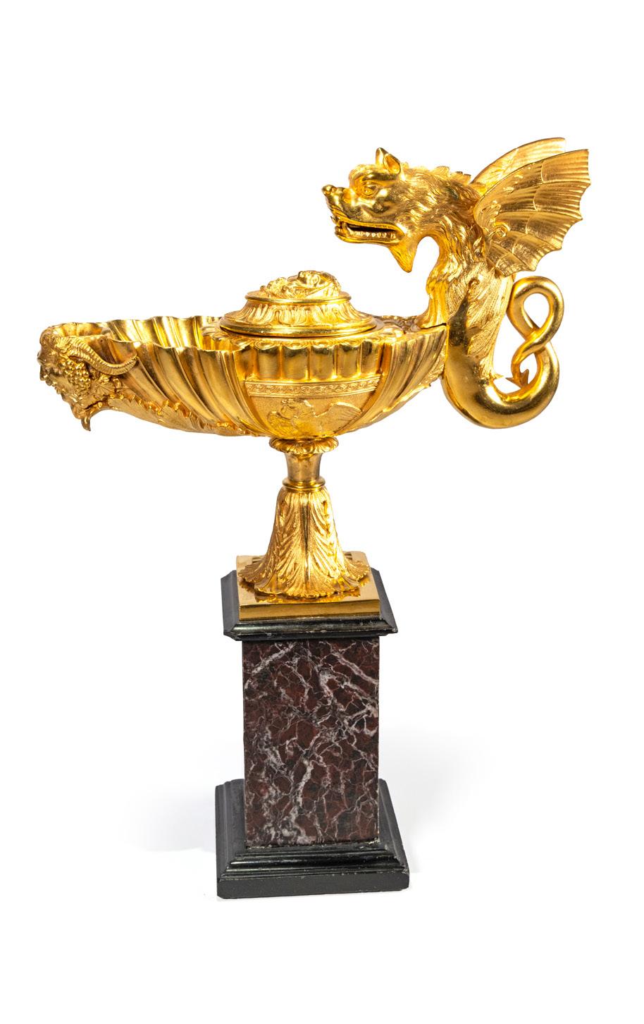 CALICE LITURGICO IN BRONZO DORATO, XVII SECOLO caratterizzato da ricca e minuziosa decorazione in rilievo composta da motivi fusi e cesellati. Sottocoppa scandita da due ordini di decorazione; nella parte superiore quattro lunette con i momenti della cattura di Cristo (ultima cena, lavanda dei piedi, orazione nell’orto di Getsemani e cattura di Cristo), alternate a teste di cherubino e motivi traforati di congiunzione; nel registro inferiore sono raffgurati i quattro evangelisti entro cartigli. Nodo con cherubini e palmette, elementi decorativi ripresi con varianti sul piede circolare. Sotto il piede un rosone e data incisa 1692 cm 21
