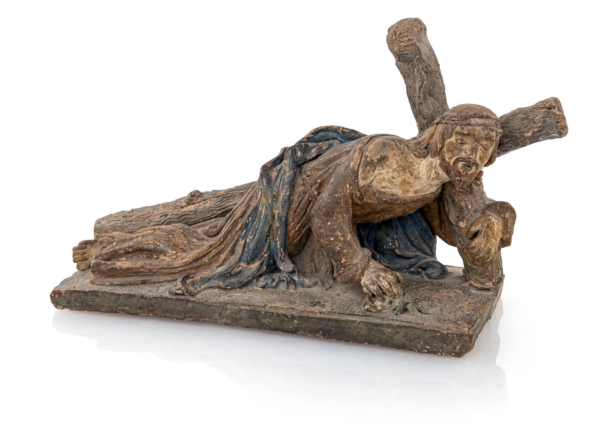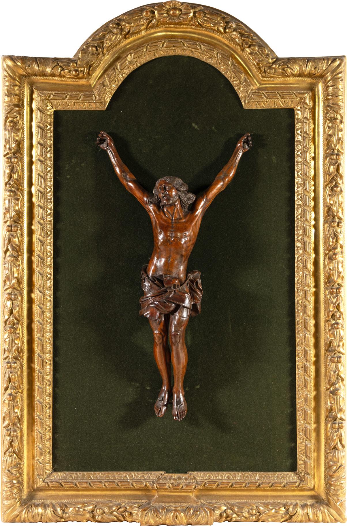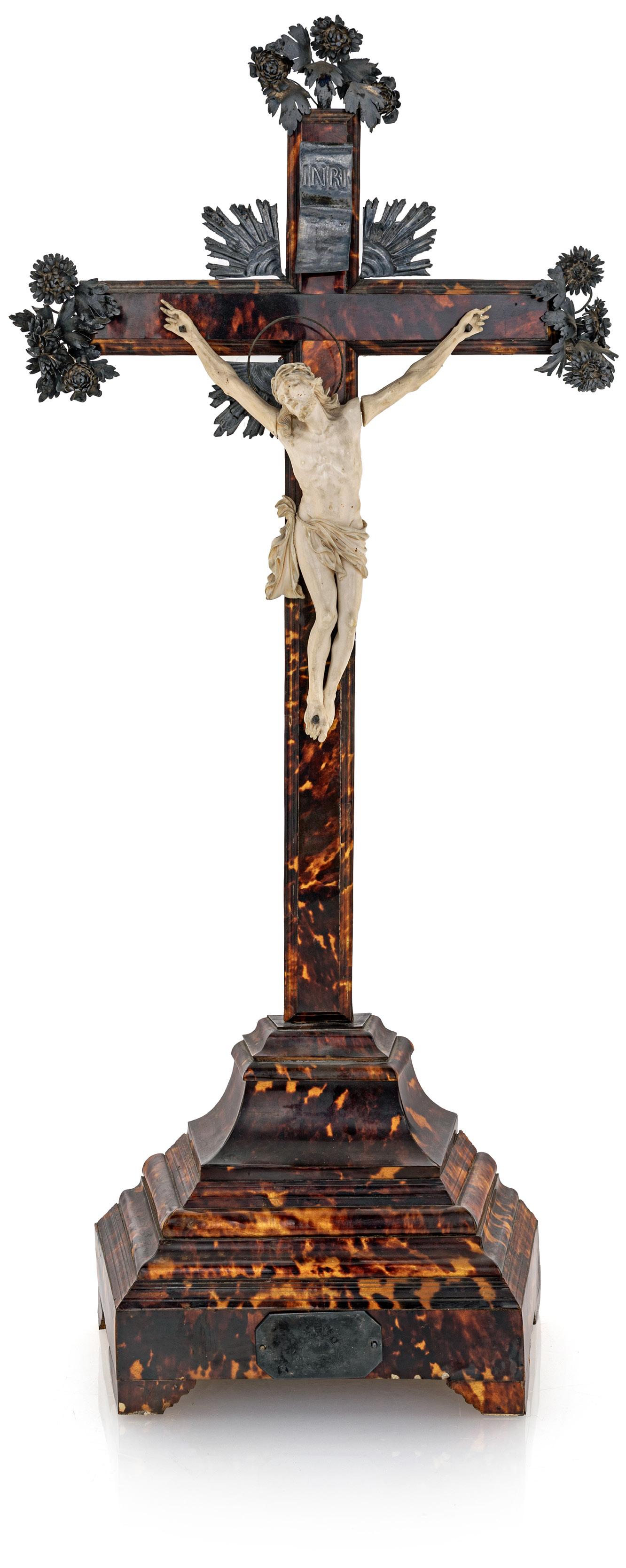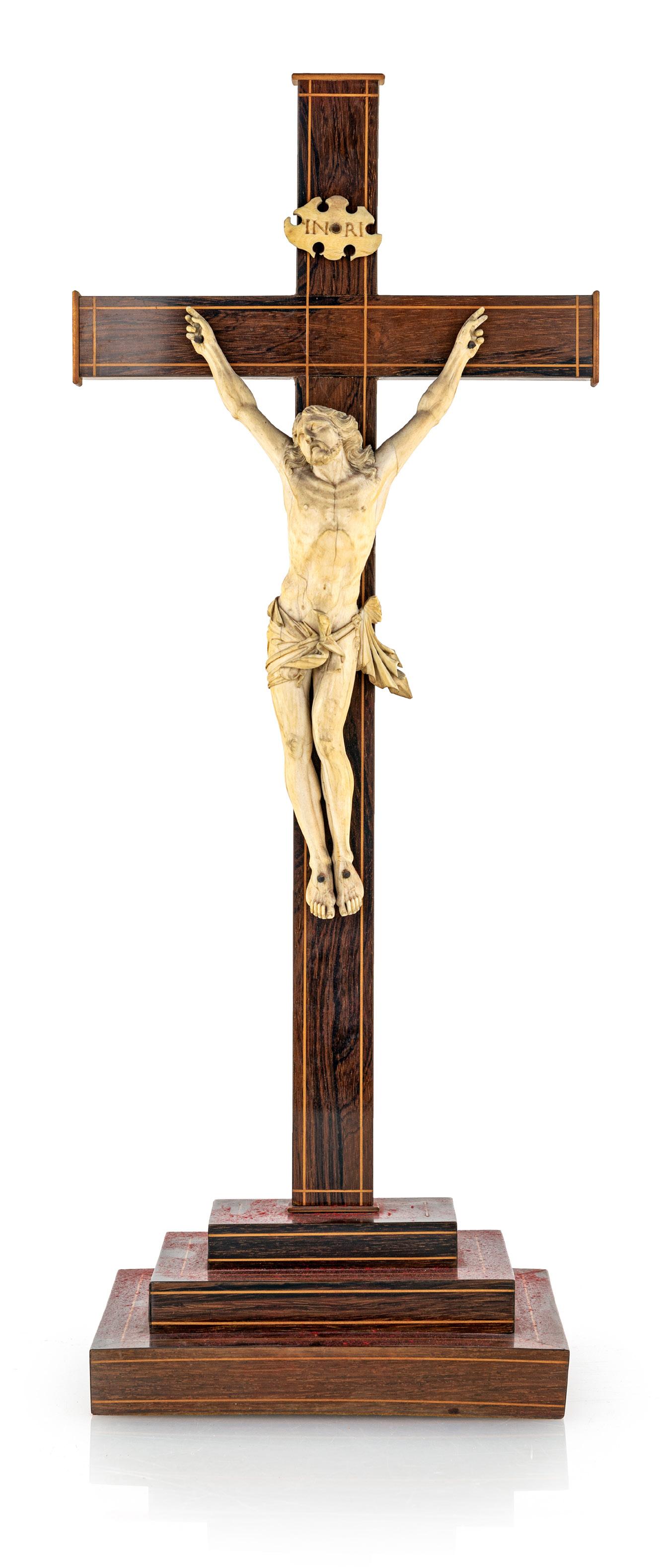 Il contrasto tra i materiali, come l’avorio chiaro, il legno caldo e il marmo freddo, arricchisce l’effetto visivo, elevando la fgura a un oggetto di grande valore devozionale. L’insieme, elegante e armonioso, combina spiritualità e raffnatezza, trasformando questa piccola scultura in un momento di meditazione intima sulla croce e sul sacrifcio imminente, capace di suscitare emozione e invitare alla contemplazione. altezza cm 30 - la fgura cm 9