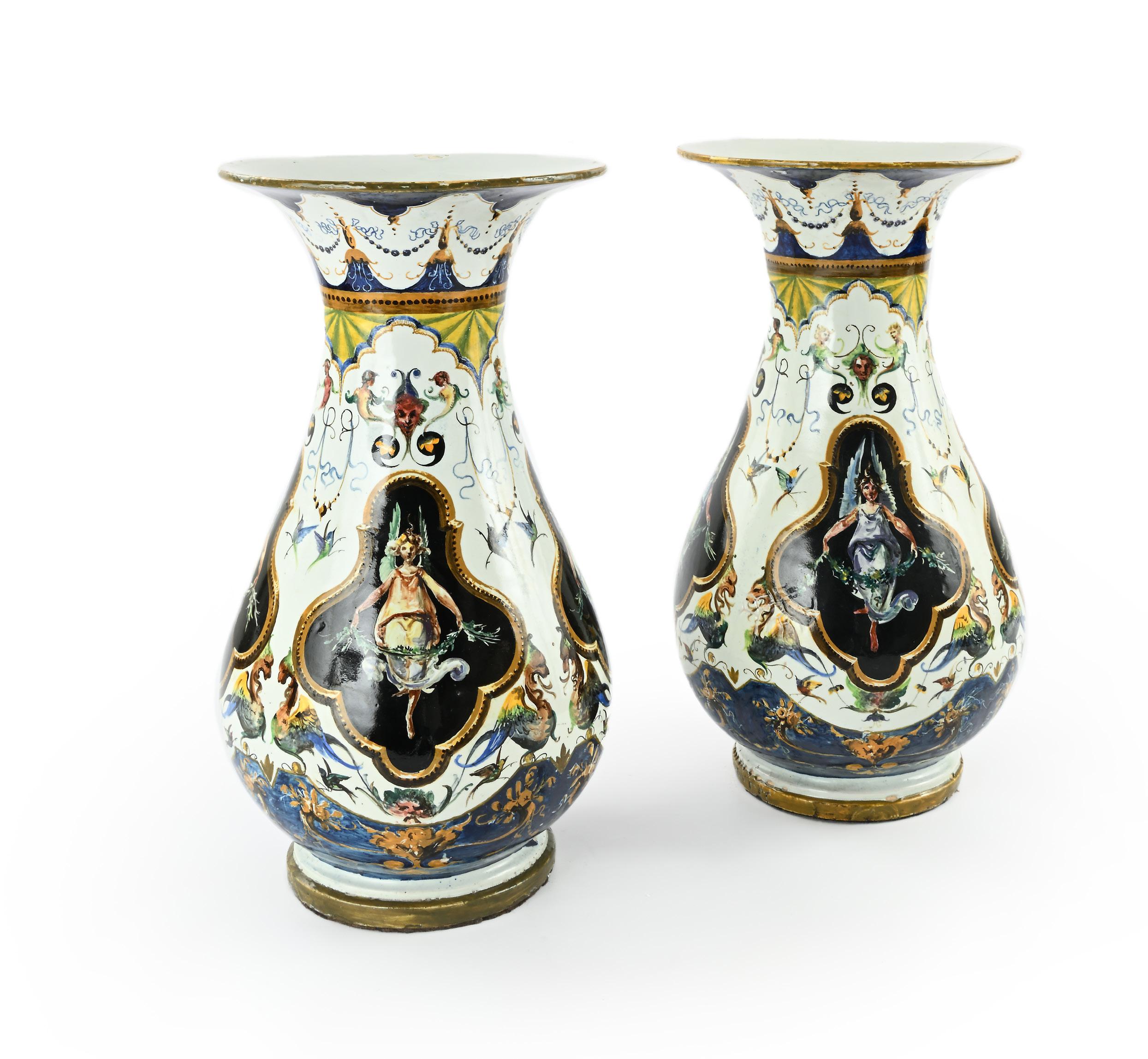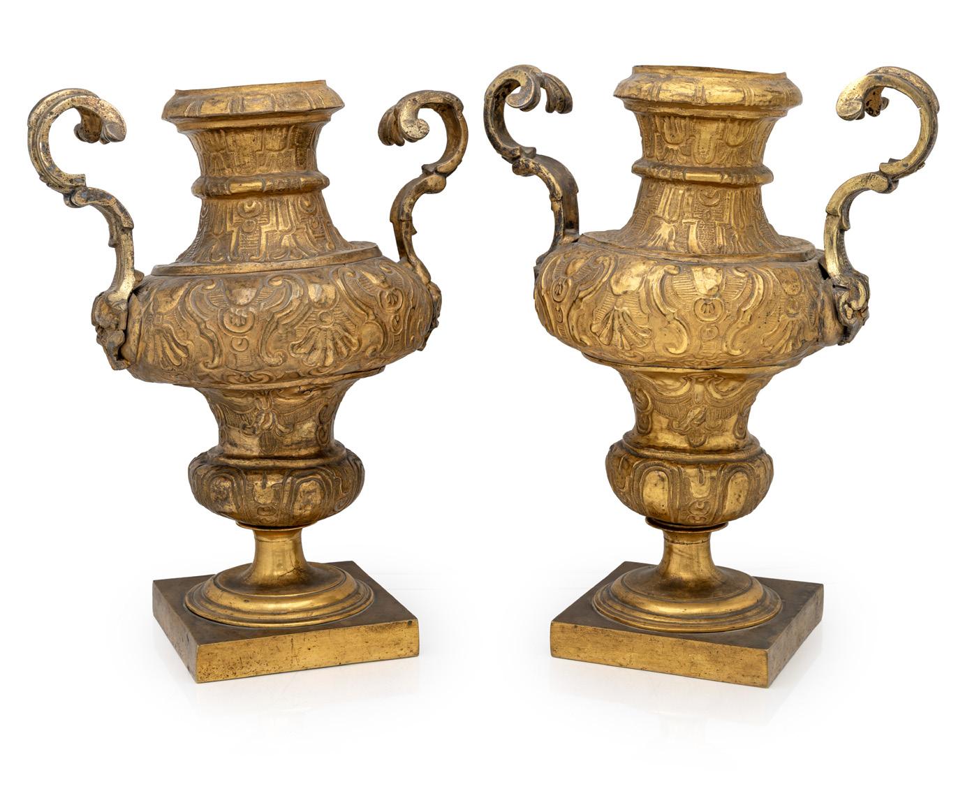 COPPIA DI VASI IN RAME SBALZATO E BRONZO DORATO, XVII SECOLO caratterizzati da elaborati decori vegetali con manici sagomati con estremità superiore incurvata cm 30x24x15,5 ca.