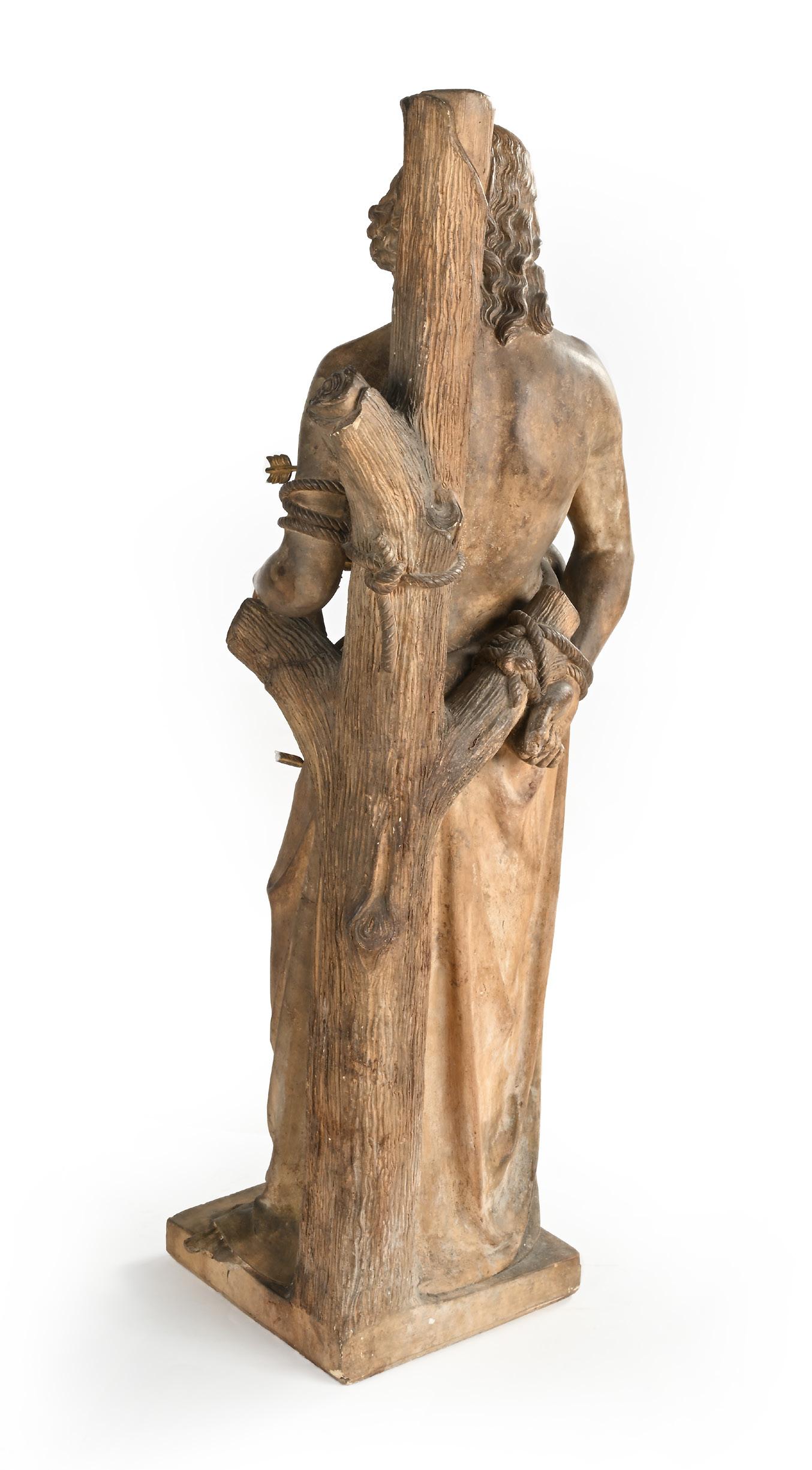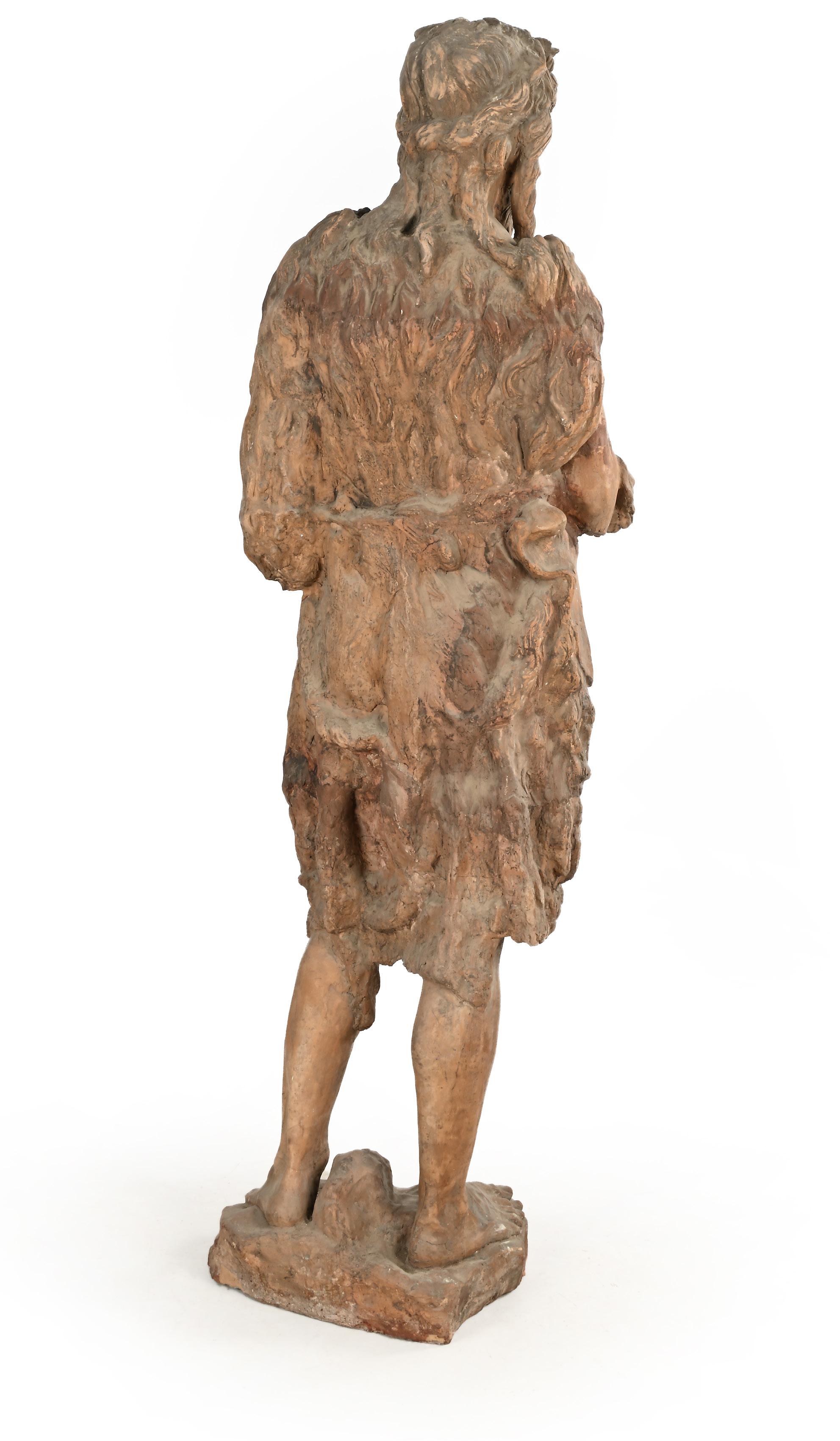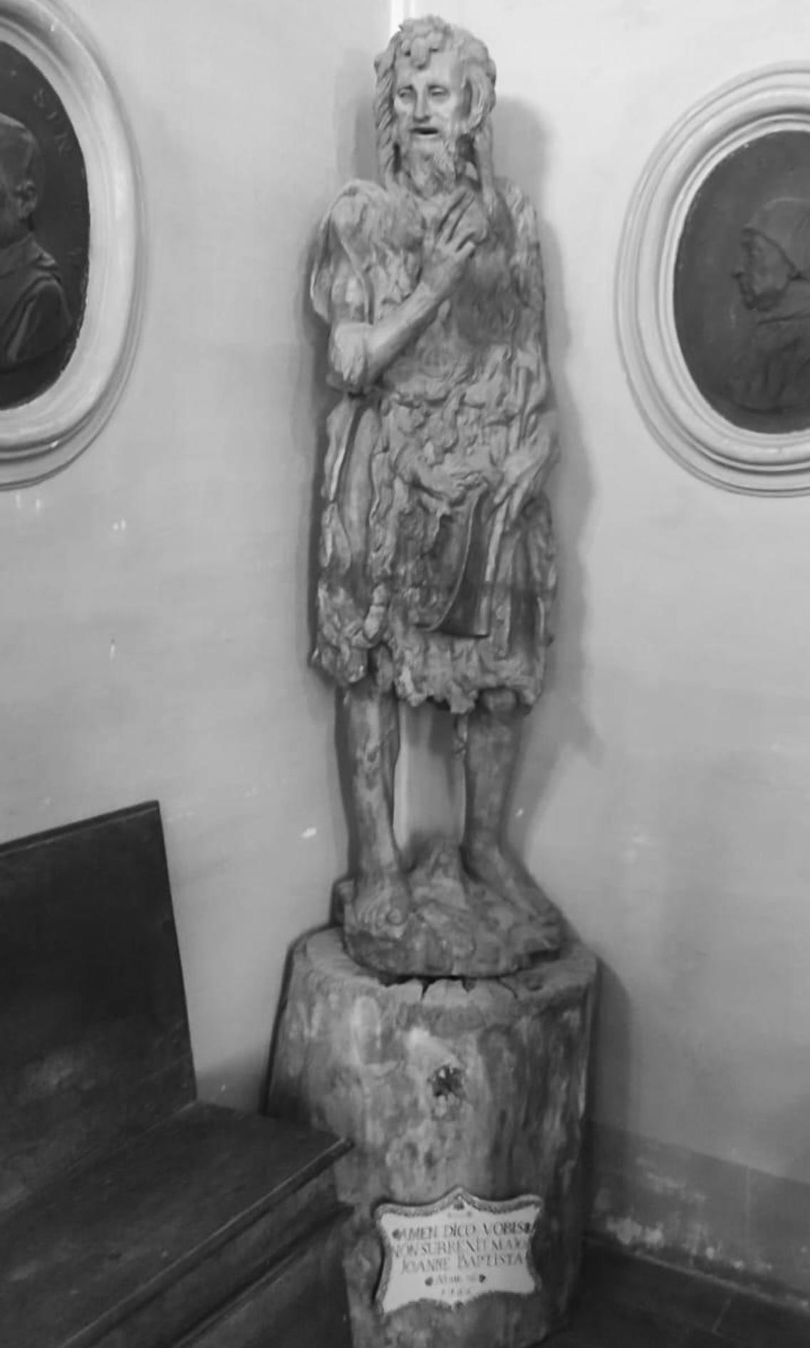 la fgura del Cristo Bambino che abbraccia la croce è un’iconografa tipica della tradizione devozionale barocca e post-barocca e anticipa simbolicamente la Passione e si inserisce in un flone iconografco legato alla spiritualità controriformata, che esaltava la meditazione sulla Passione fn dall’infanzia di Cristo. Bambino è presentato come il Salvator Mundi con lo sguardo diretto verso l’osservatore, la mano destra in segno di benedizione e il braccio sinistro a sostegno della croce, simbolo dell’universalità della redenzione. E’ ritratto seduto su un cippo e poggia su un piedistallo circolare stante su rocchetto in legno tornito e lucidato.
