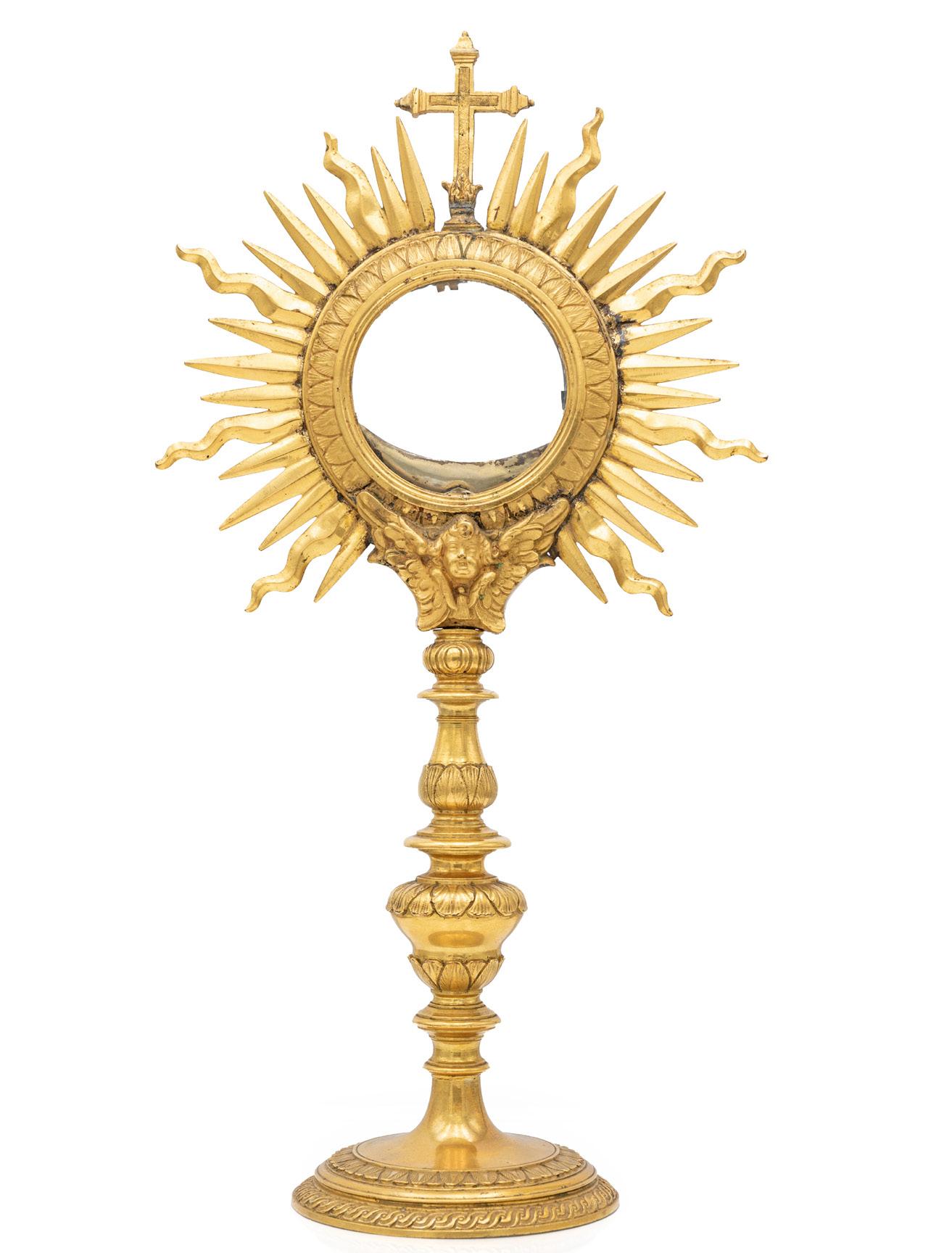 OSTENSORIO IN BRONZO DORATO, XVIII SECOLO teca circolare racchiusa da cornice a palmette, con raggiera a “sole” con raggi fammeggianti e dritti alternati, sormontata da croce; all’interno lunetta a sostegno dell’ostia. Fusto a balaustro composito collegato alla teca da una testa di cherubino ad ali spiegate; base circolare sottolineata da due ordini di decorazione a palmette e onde continue cm 37x19