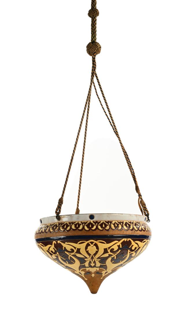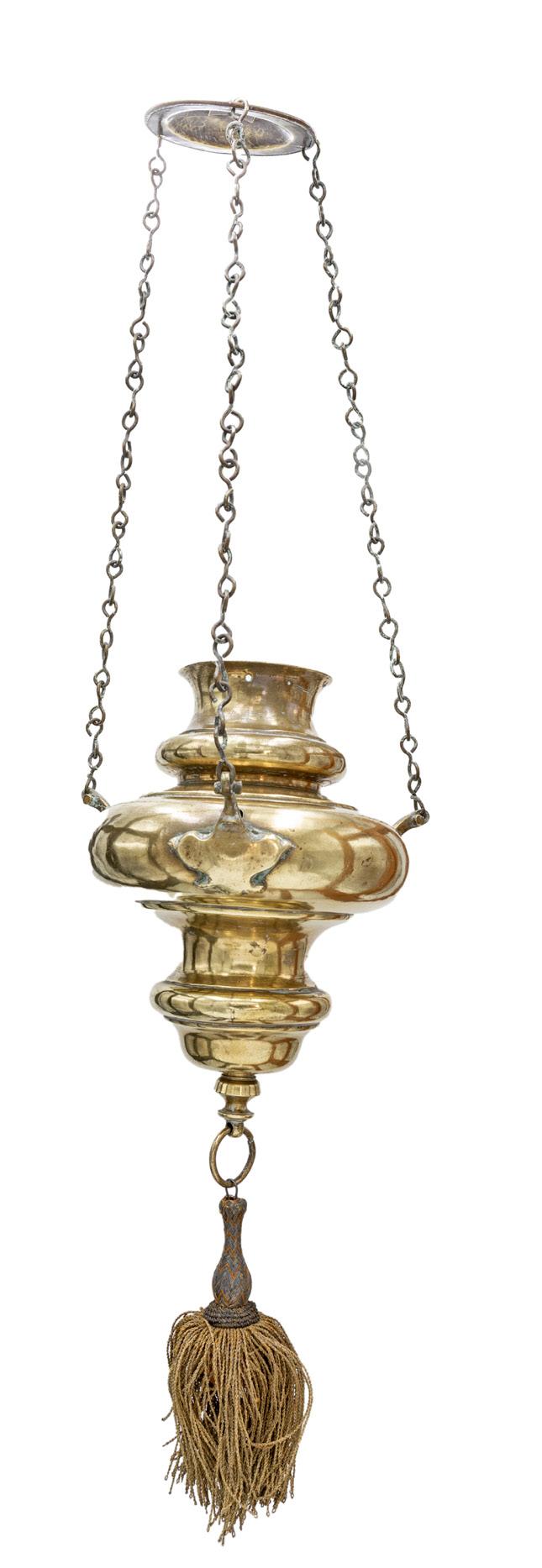 LAMPADA VOTIVA PENSILE IN OTTONE DORATO, XVIII SECOLO corpo centrale sorretto da catene collegate ad un piattello superiore; vertice inferiore impreziosito da nappa per bilanciare esteticamente l’oggetto altezza cm 55
