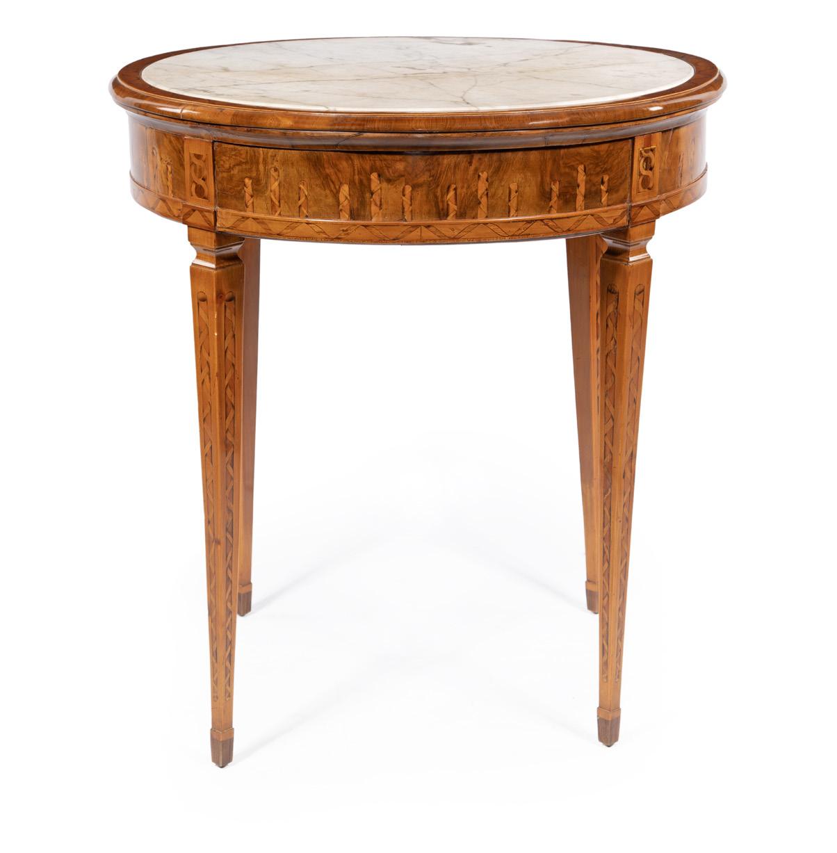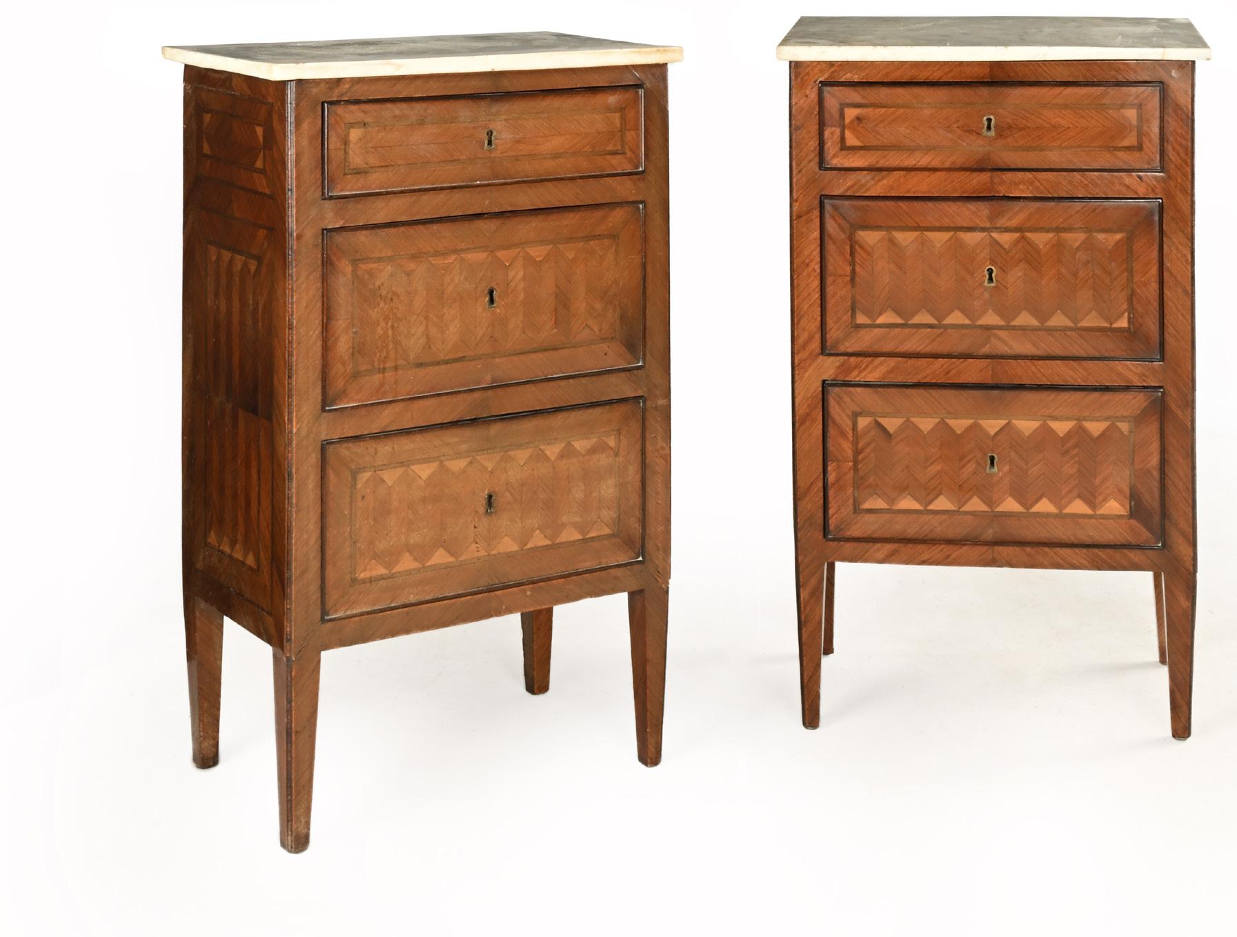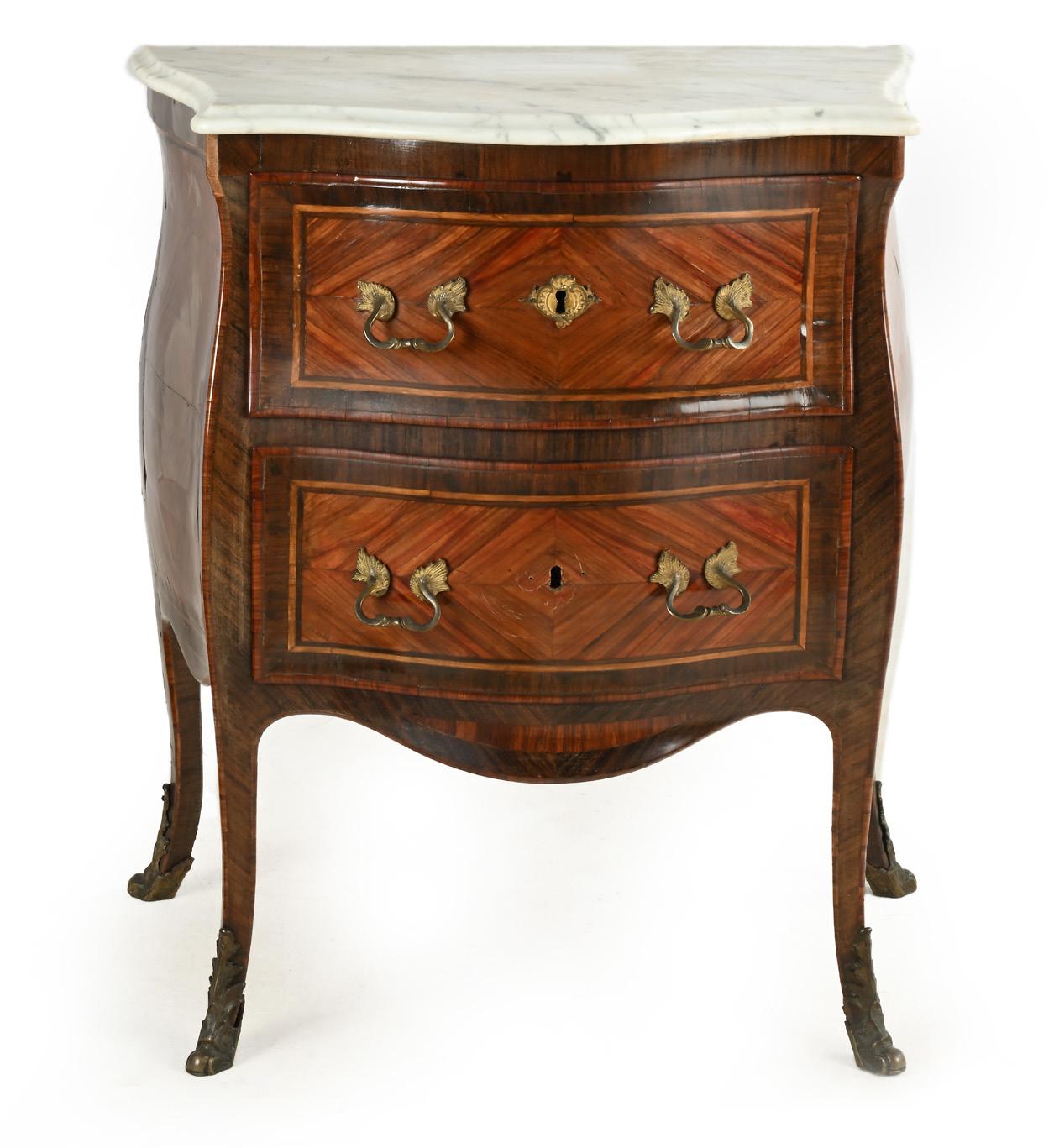 piano rettangolare con proflo sottostante dentellato, un cassetto nella fascia delimitato da rilievi romboidali e due ante sottostanti con paraste guillochées, piedi a mensola.