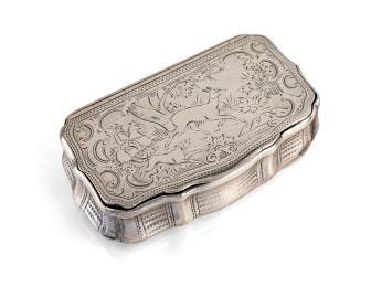 argento 800/000 coperchio incernierato con superficie caratterizzata da fitto tratteggio zigrinato; fascia percorsa da nervature parallele