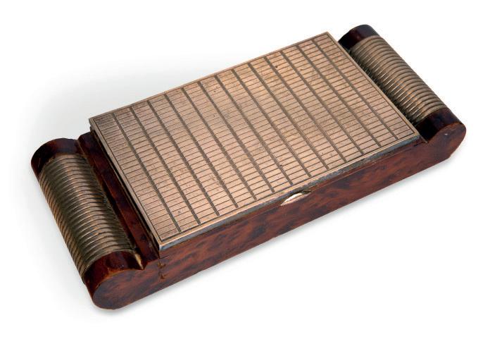 SCATOLA PORTASIGARETTE IN RADICA E ARGENTO 800/000 coperchio incernierato caratterizzato da fitta ornamentazione a caselle incise, delimitato da elementi cilindrici
