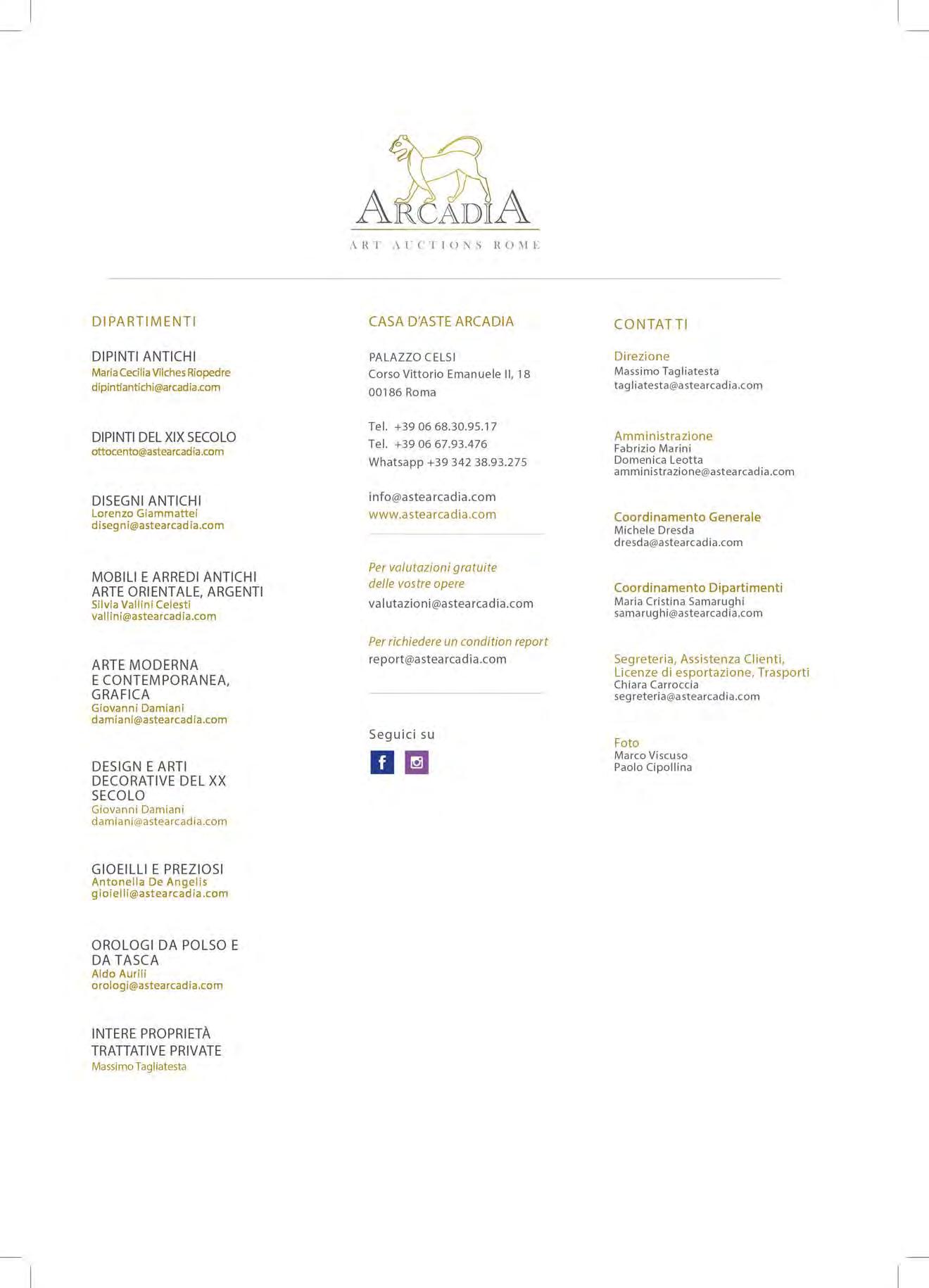 These Terms of Sale governed by Italian law are tacitly accepted by all parties participating in the sale at auction procedure and are at the disposal of any party which requests them. The court of Rome shall have exclusive competence for any dispute related to sale at auction activities at Arcadia.