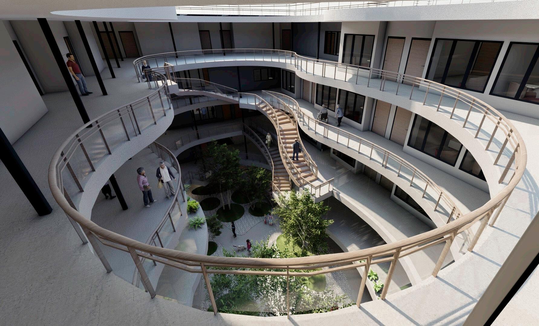 24 hour emergency services that providing health care + support for various types of the residents’ health conditions. Landscape and green space with shading to improve emotion of the resident’s lifestyle