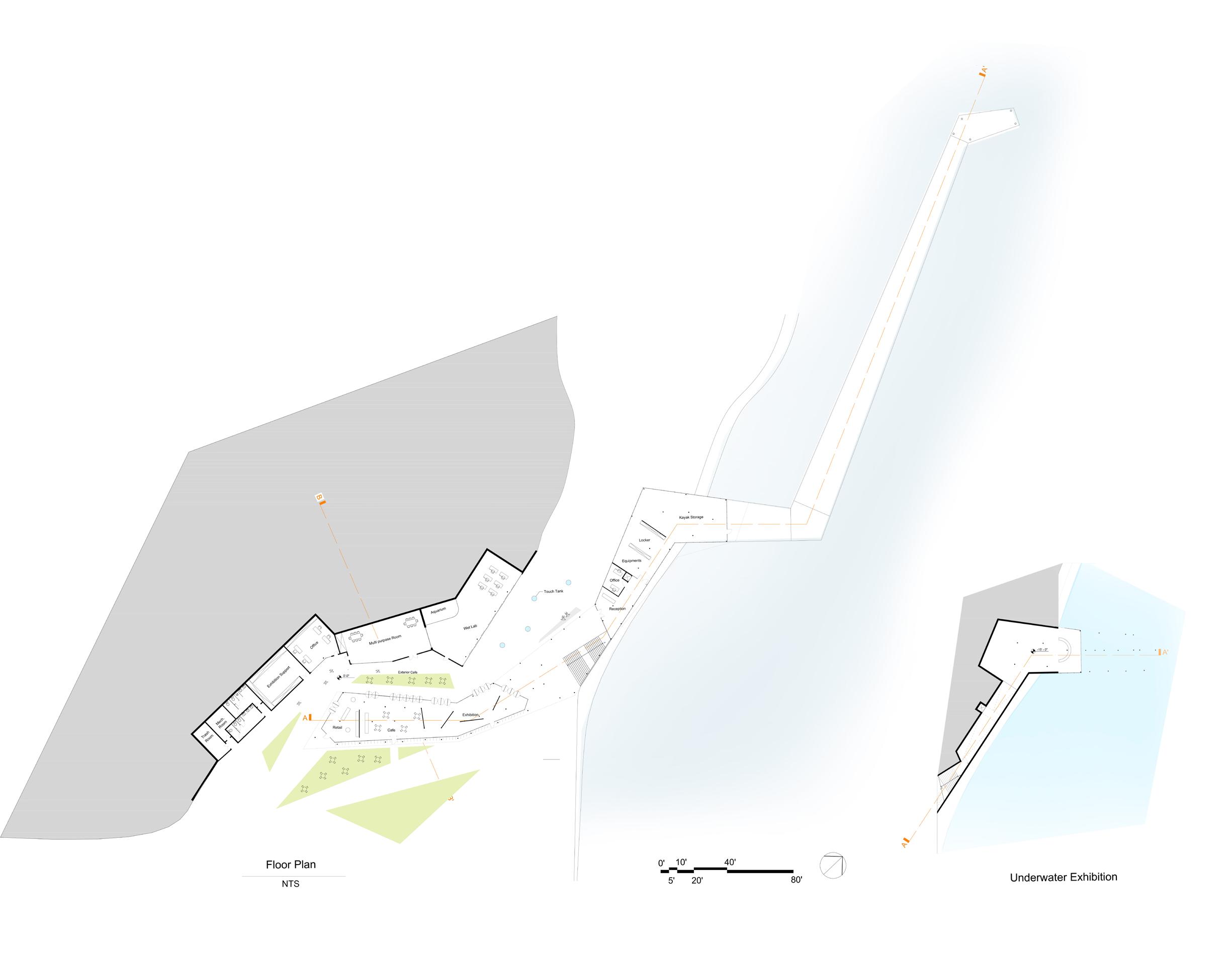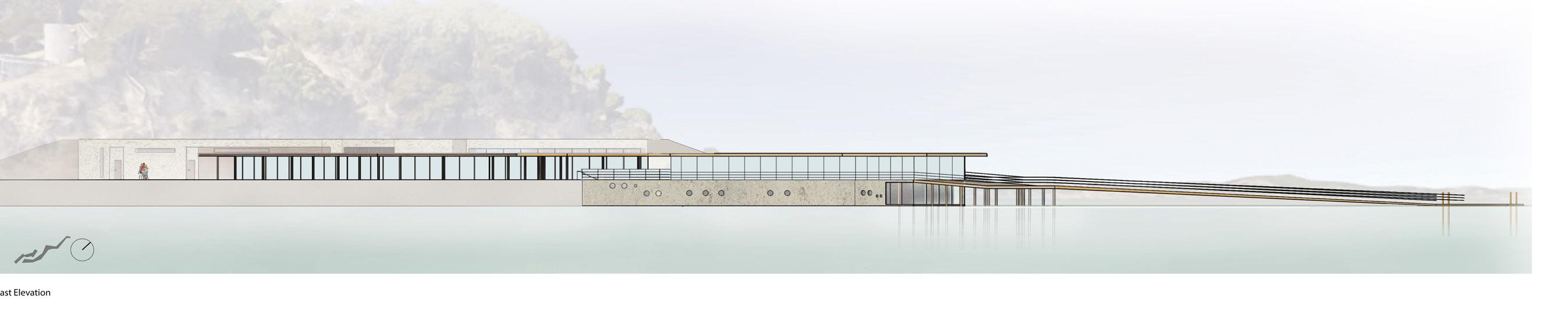 The project consists of two buildings positioned close to each other, with a courtyard in between. The administrative offices and rooms are embedded into the hillside, while the exhibition space is located at the front, featuring a glass wall that offers an unobstructed view of the water. Additionally, there is another exhibition space near the water, designed with an underwater viewing area that changes with the tides, providing a dynamic and immersive experience.