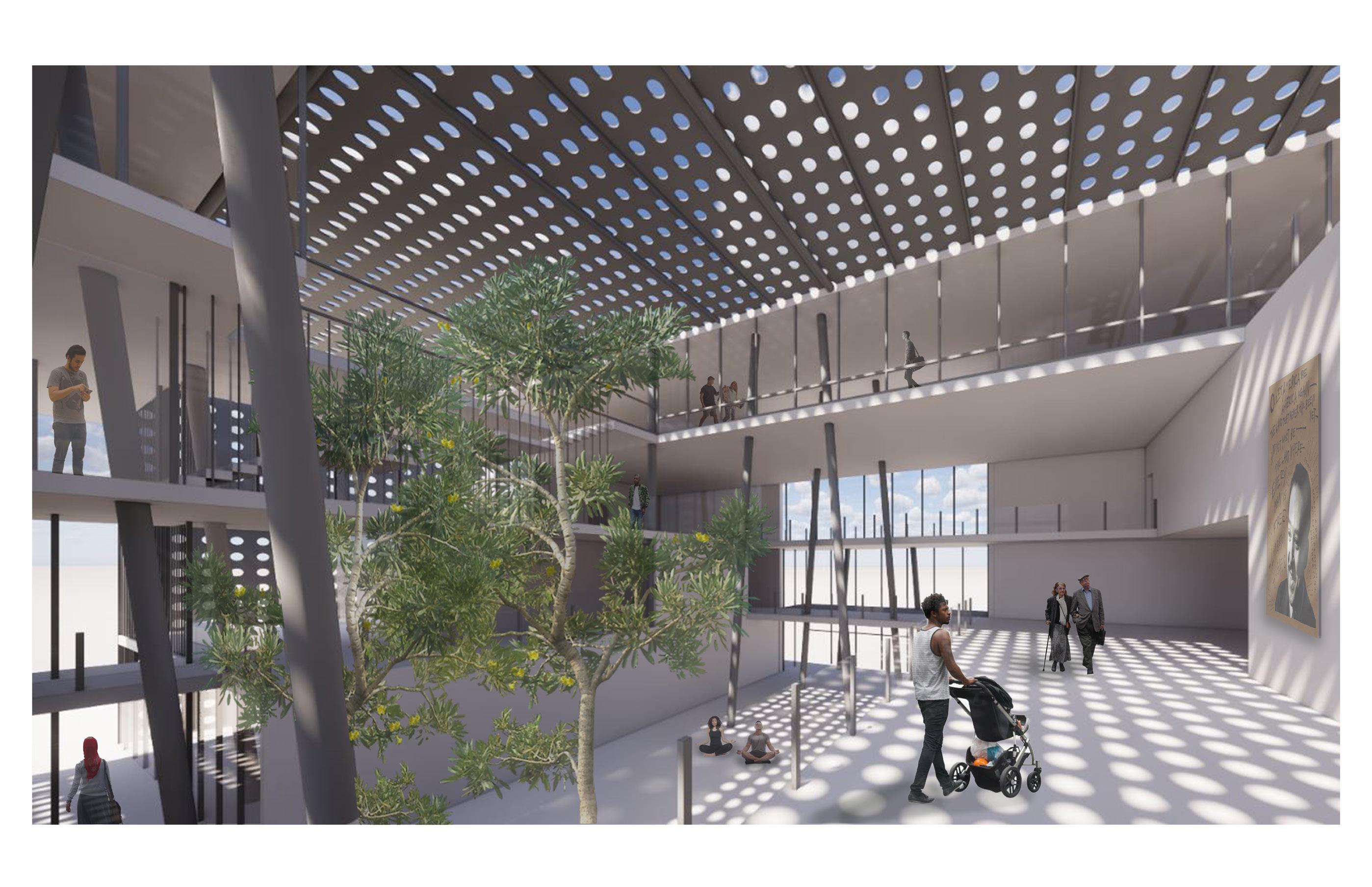 At the heart of the structure lies the theater, a bold architectural mass surrounded by open walkways and gathering spaces. These pathways allow visitors to move freely around the building while maintaining an unobstructed visual connection to the bustling pedestrian promenade below. The interplay between interior and exterior dissolves traditional boundaries, engaging both theatergoers and passersby in an immersive cultural experience.