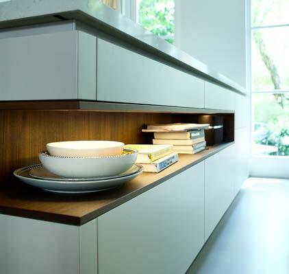 Een keukenontwerp waarin persoonlijke elementen verwerkt konden worden, zoals de horizontale verdieping in de lange zijde van het eiland. Het eiland in mohair is gecombineerd met hoge kasten in walnoot fineer.
