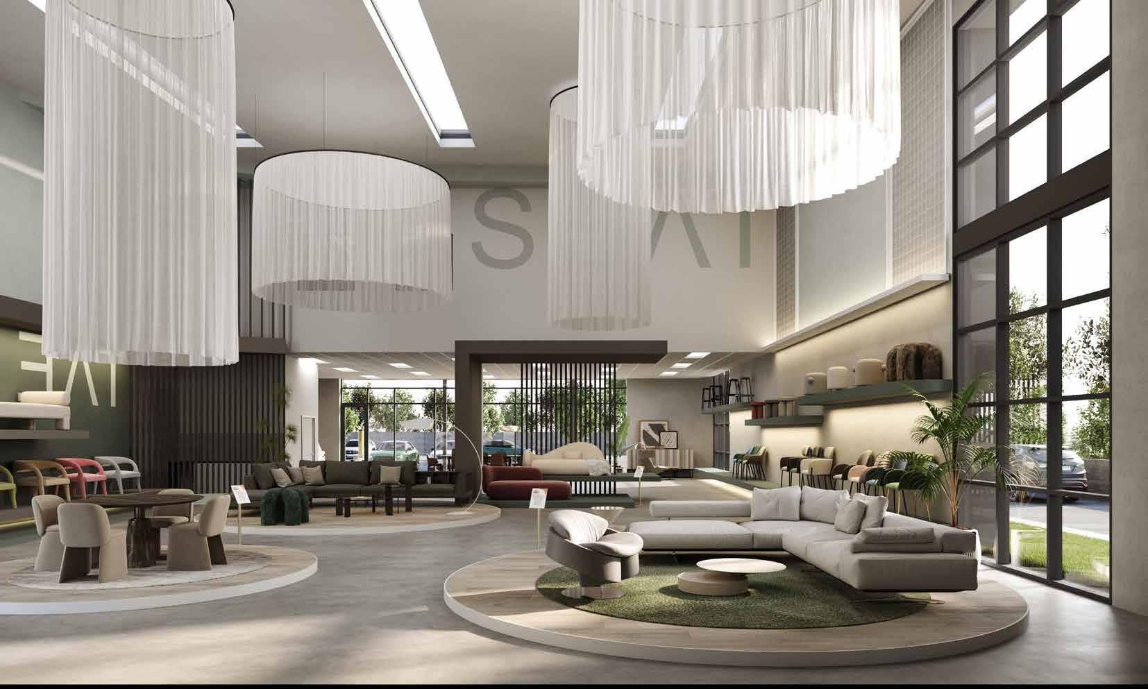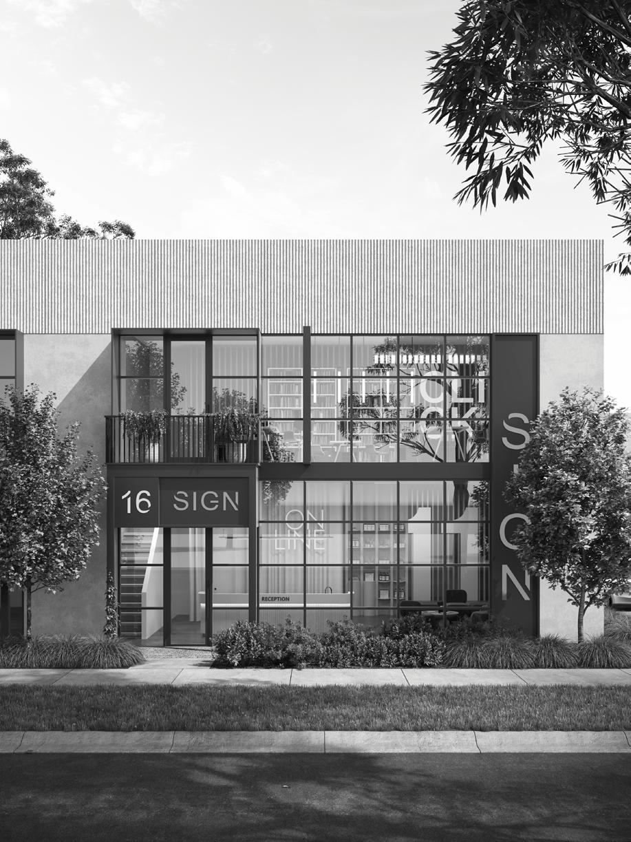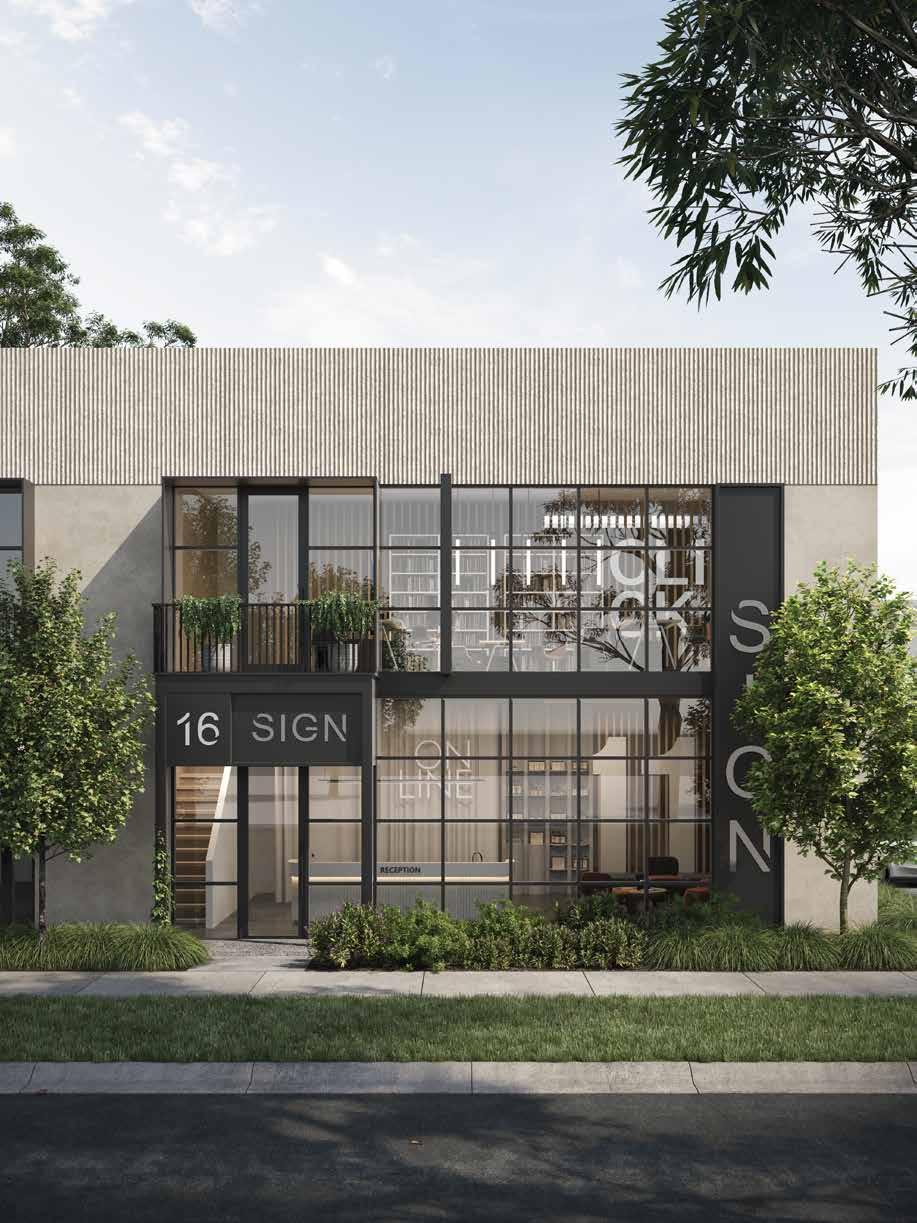 The architectural design integrates sleek concrete surfaces with ribbed architectural forms creating a striking balance between the black shade privacy fins and loft-style windows, complemented by curved edges and canopies that support climbing greenery, blending urban sophistication with natural elements. The design strategy not only enhances aesthetic appeal but also emphasizes sustainability through green spaces and efficient use of natural light. The key design philosophy was to cultivate an inviting and dynamic environment that inspires both businesses and visitors alike. The building also incorporates ample space for prominent signage, strategically positioned to maximize visibility and enhance branding opportunities.