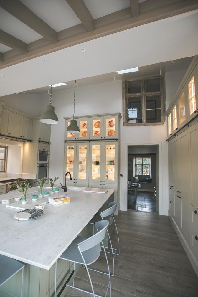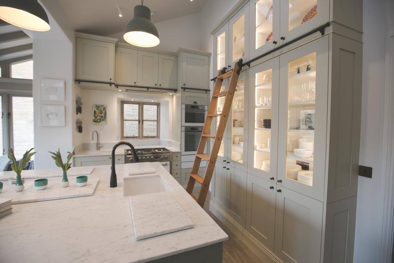 Attention to detail is key here Incorporate a glass fronted cupboard to give your small items a home of their own and invest in comfy high bar stools to encourage socialising during meal prep