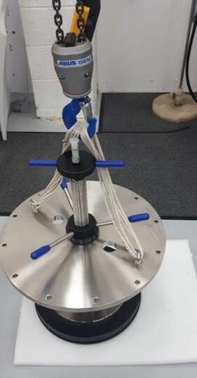 13. Using appropriate lifting slings attach the hoist to the adjuster assembly and lift the unit high enough to allow the flow cell assembly to be fitted.