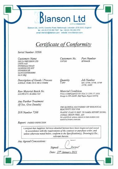 All materials in contact with the process stream have been selected for their suitability for use in equipment utilised in biopharmaceutical applications , and either conform to relevant sections of FDA code of Federal Regulations Vol. 21, 170 - 199 and/or have passed the USP Class VI test for in vivo toxicity.