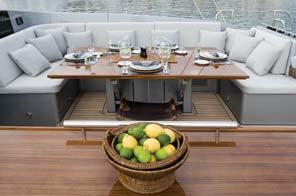 De buitenkant van de Mystère valt op door het ordelijke gladdek, dat alleen gebroken wordt door het lage hutdak, de luikhoofden rondom de dubbele roeren en de patio van de eigenaar, uitnodigend in het teaken dek verzonken. De goede zichtbaarheid draagt bij aan het comfort aan boord. “De eigenaars moeten niet op de tippen van hun tenen gaan staan om uit de salonvensters te kijken of om over het hutdak uit te kijken,” zegt Tripp. Hij herinnert zich nog goed de discussies met de eigenaar: zouden ze twee stuurhutten bouwen of maar één? De eigenaar vond dat de privéruimte een isolerend gevoel zou geven. Uiteindelijk hebben ze toch voor twee stuurhutten gekozen.