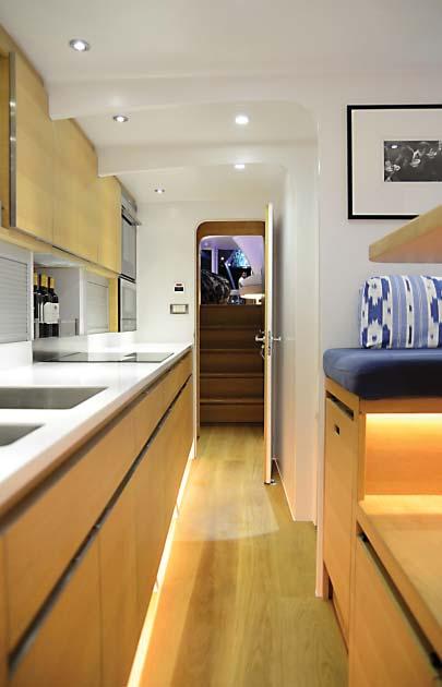 Het ruime salon is bijna cirkelvormig en biedt een fenomenaal uitzicht vanuit de zit- en de eethoek. Via een deur in de voorruit kom je bij een grote zonnebank op het voordek, waarover een zeil gespannen kan worden tussen koolstofvezel palen in het dek om zo voor schaduw te zorgen.