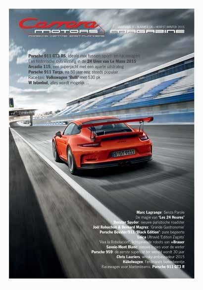 Niets uit deze uitgave mag worden verveelvoudigd en/of openbaar gemaakt door middel van druk, fotokopie, elektronisch of op welke wijze dan ook, zonder voorafgaande schriftelijke toestemming van de uitgever. Aan de samenstelling van deze uitgave werd de uiterste zorg besteed, desondanks kan niet worden ingestaan voor de feitelijke juistheid of volledigheid van de opgenomen gegevens. In geen geval kan er een juridische basis worden aan ontleend. De redactie en uitgever aanvaarden geen aansprakelijkheid voor de volstrekte juistheid en volledigheid van gegevens van de in deze uitgave opgenomen teksten. ©2007-2015 Carrera Motors Magazine.