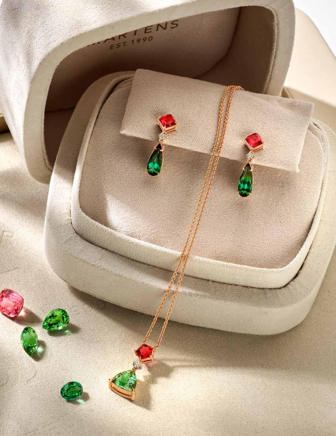 In elk juweel schuilt een verhaal dat begint bij de selectie van uitzonderlijke edelstenen. De warme gloed van rosegoud omlijst het spel van groene en rode toermalijnen, zorgvuldig samengebracht tot een uniek ontwerp.