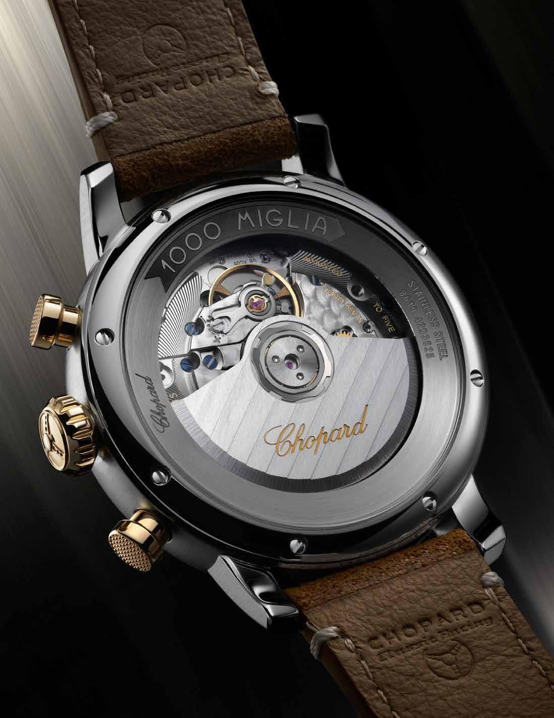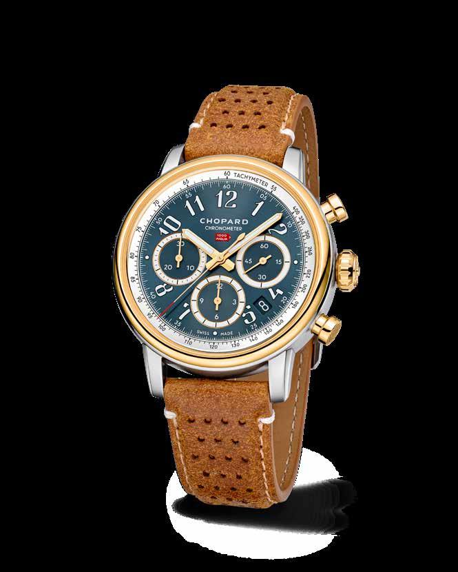 Chopard combineert een 40,5 mm kast van Lucent Steel ™ met accenten in 18kt geelgoud. De Grigio-Blu  gelakte wijzerplaat met satijnafwerking en Super LumiNova cijfers geeft het horloge legibiliteit en karakter.
