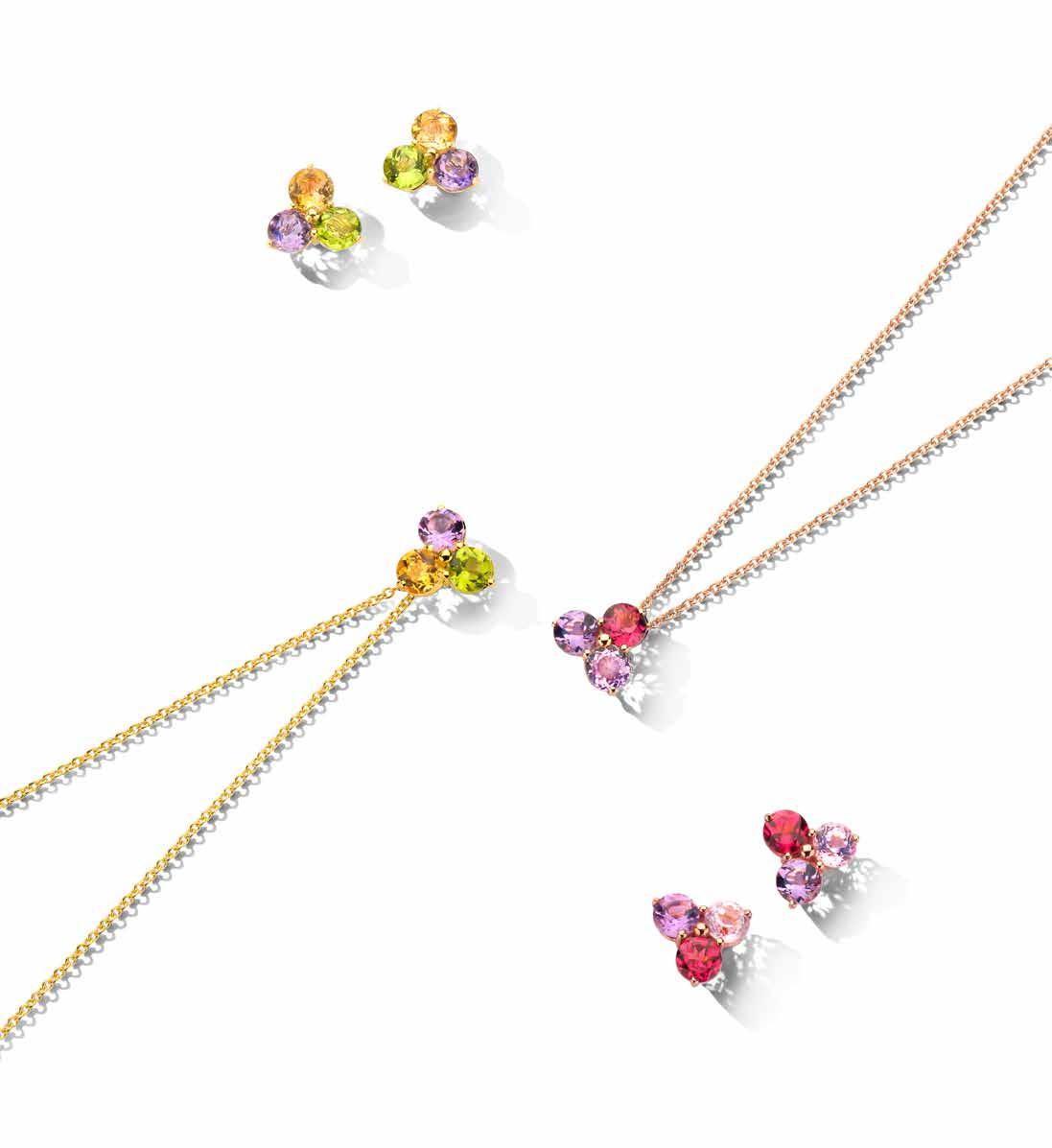 OORSTEKERS GEELGOUD MET CITRINE, AMETHIST EN PERIDOT OF ROSEGOUD MET AMETHIST, KUNZITE EN RHODOLITE € 900 |