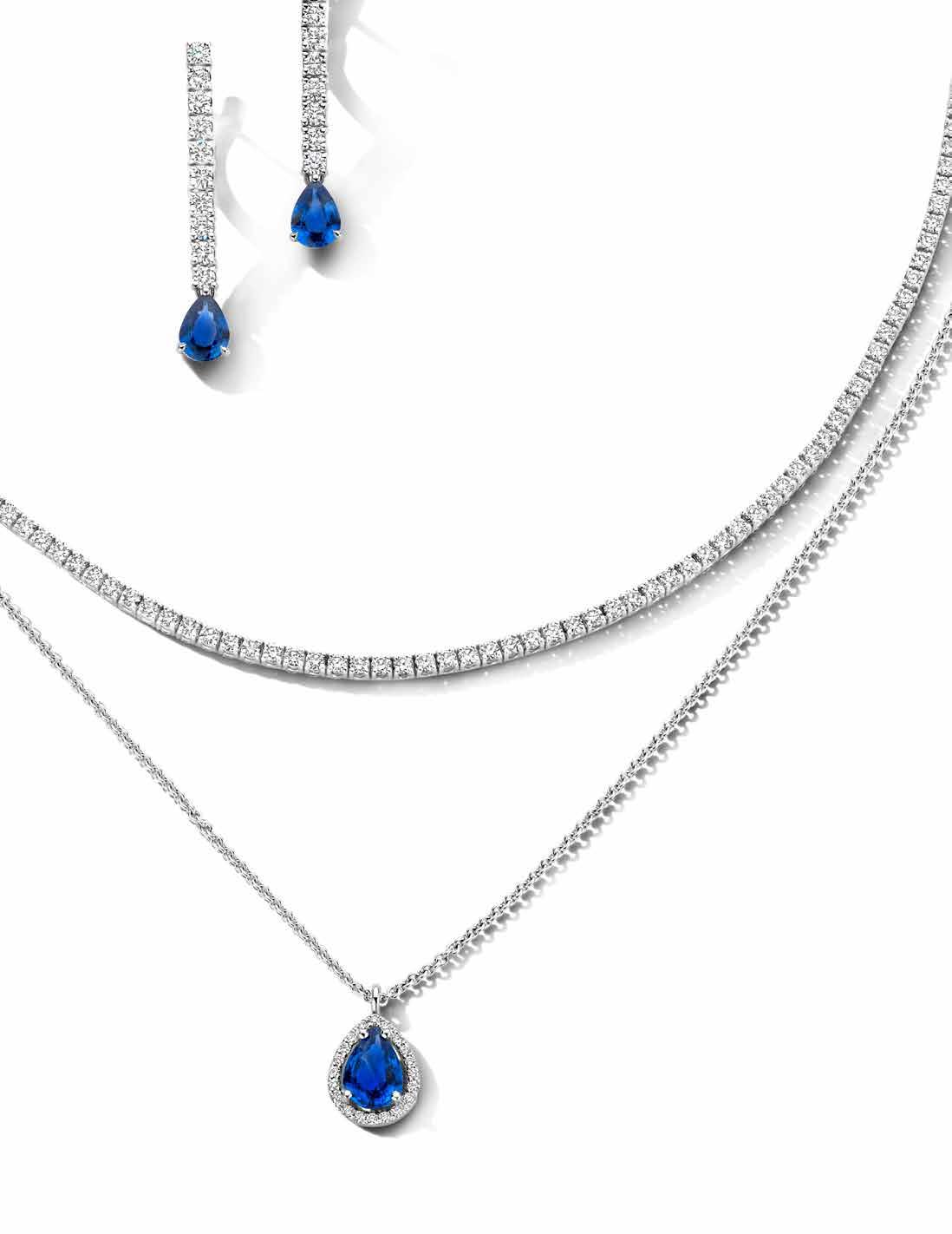 OORHANGERS MET BRILJANTEN EN PEERGESLEPEN SAFFIEREN € 4.645 | RIVIERA COLLIER MET 197 DIAMANTEN € 13.450 | HANGER MET DIAMANTEN EN PEERGESLEPEN SAFFIER € 2.975