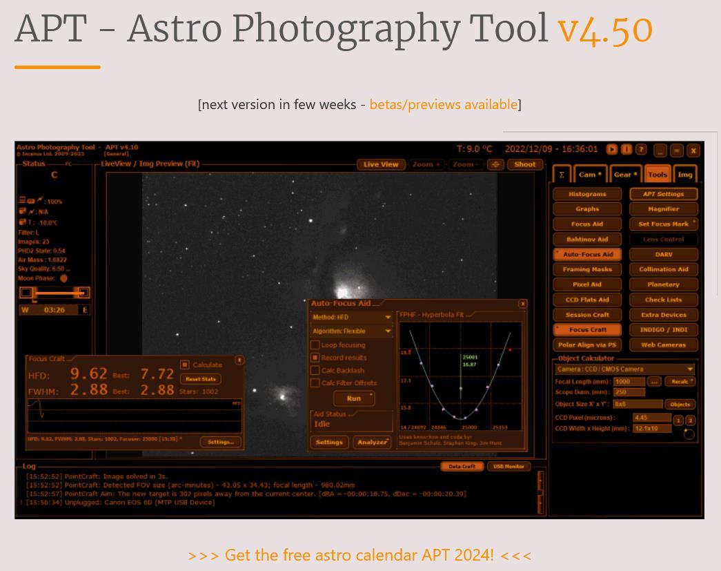 APT stands for "AstroPhotography Tool" and it is like Swiss army knife for your astro imaging sessions. No matter what cameras and other devices you have, APT has the right tool to be in help, from your first imaging attempts upto gathering scientific data. It is defining standards for an imaging and data acquisition software since year 2009 using the real-life experience of many astro photographers from all over the world and one of the APT authors. It works on MS Windows Vista, 7, 8, 8.1, 10 and 11.