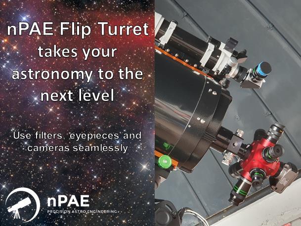 The world’s only production flip turret is now available! For the first time your filters, eyepieces AND camera can all be accommodated in the same focal plane on one unit. For large telescope owners the nPAE Flip Turret opens up new observing and astrophotography opportunities.