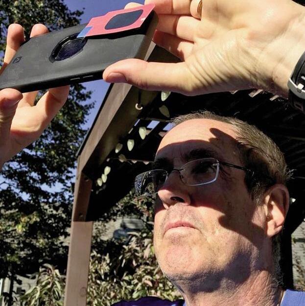 The first part of Duncan’s solution was straightforward: He took a pair of paper eclipse-viewing glasses, cut the glasses in half and trimmed off the temple, and attached a piece of Velcro to the viewing lens and a corresponding piece to his smartphone’s camera lens