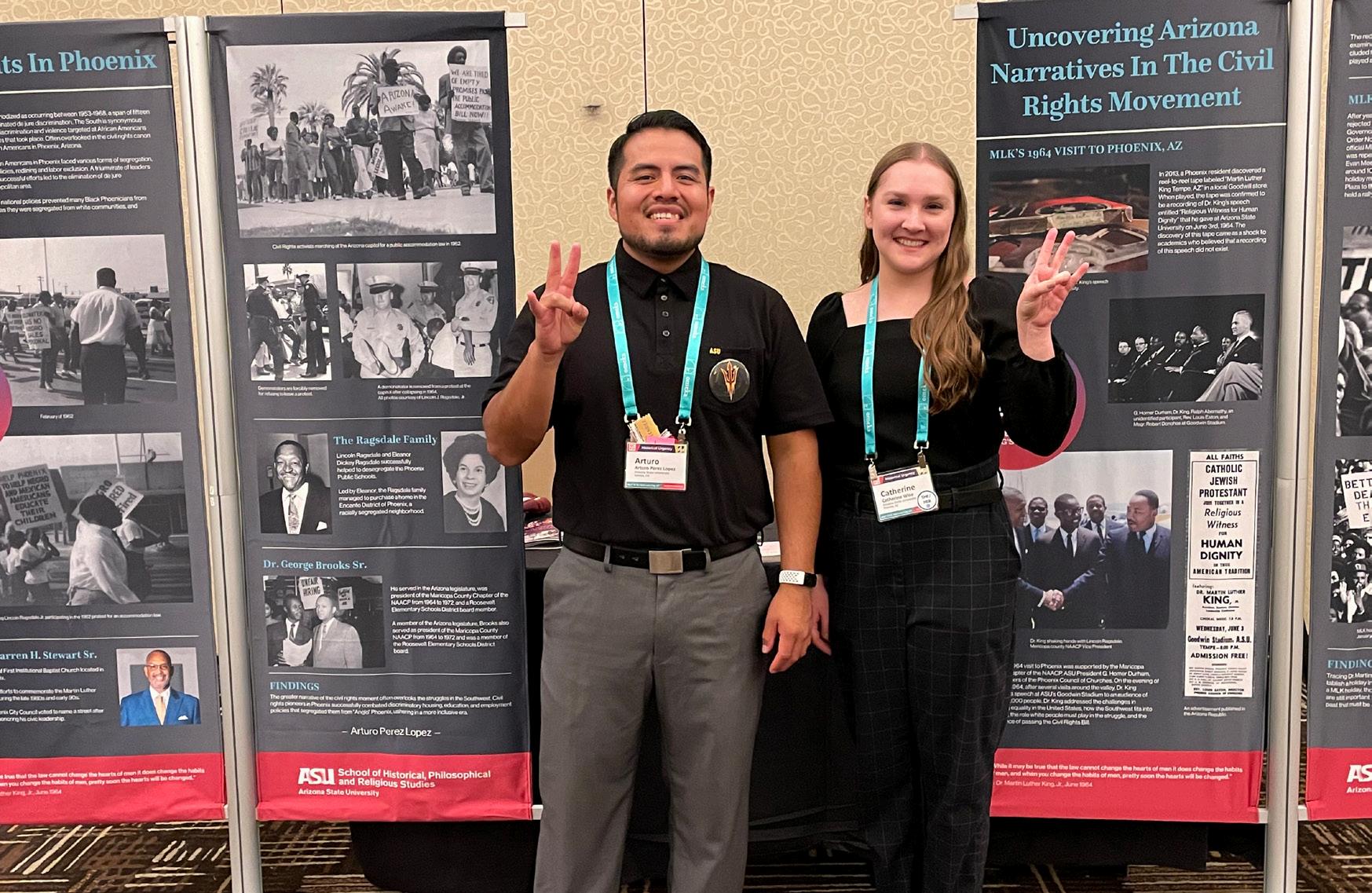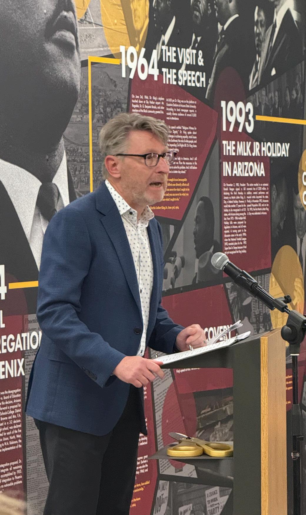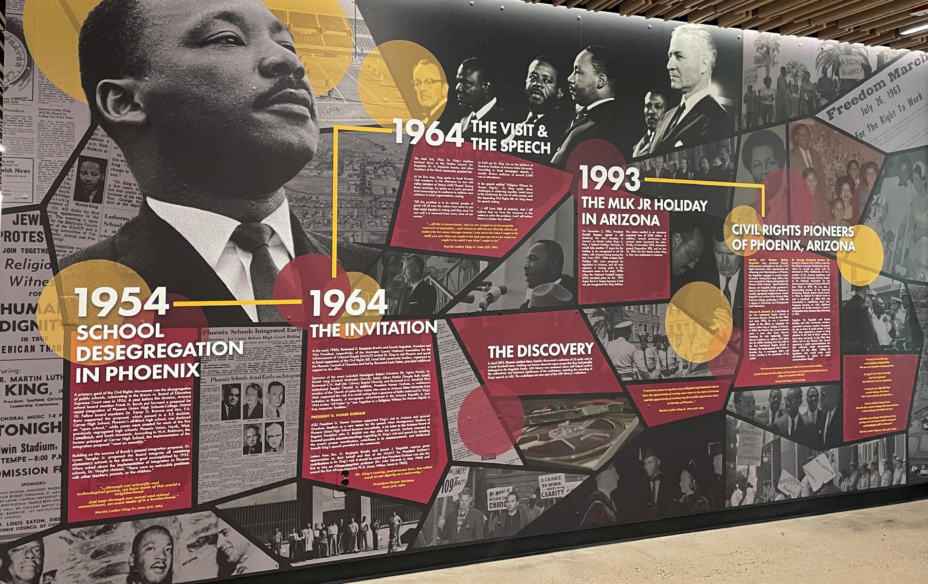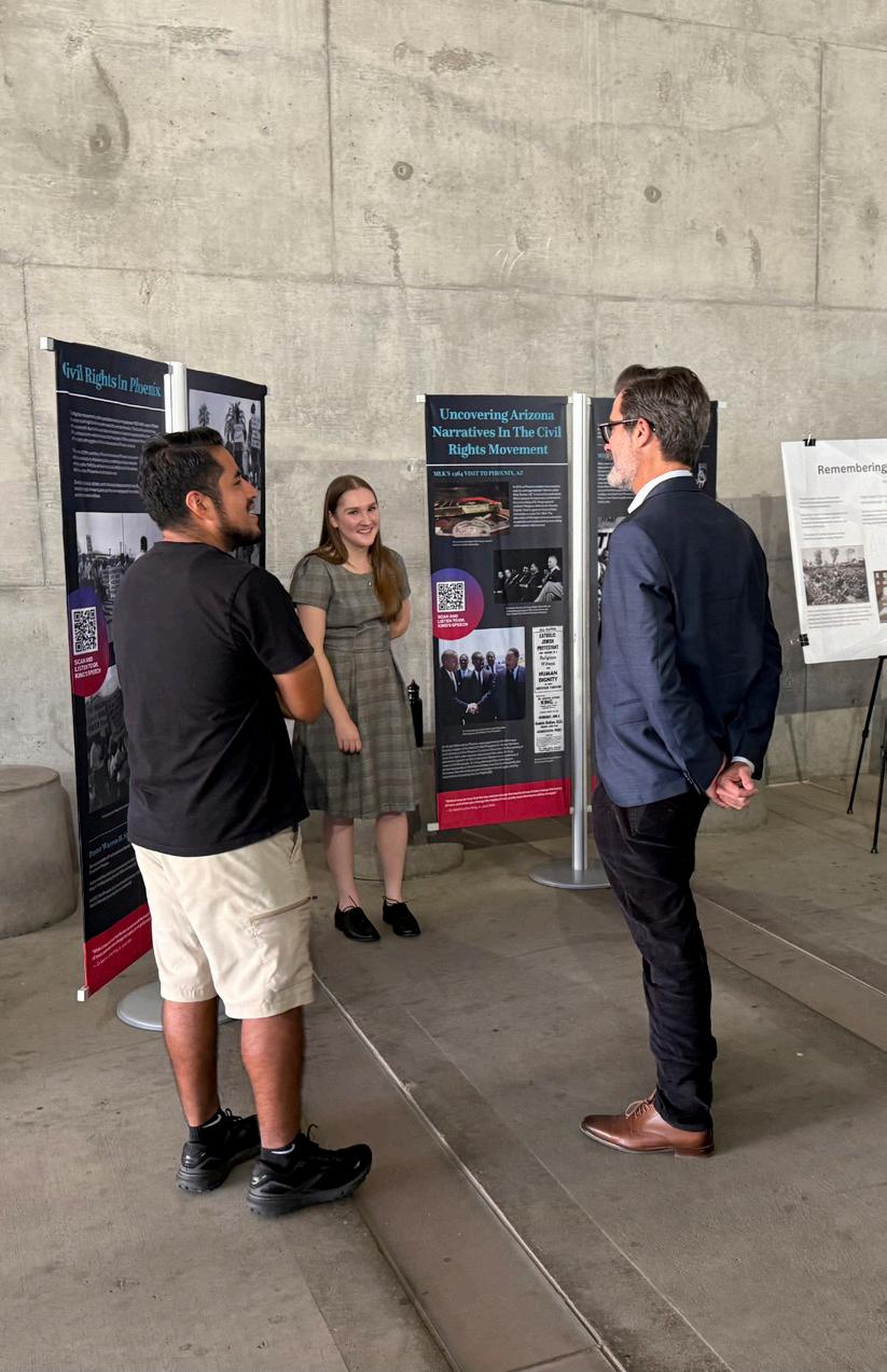 In June, 1964, a coalition of religious leaders in Phoenix invited Martin Luther King, Jr. to give a series of speeches supporting the Civil Rights bill, including a speech at ASU’s Goodwin Stadium to a crowd of over 8,000 people. There was no record of this speech until a recording found at a Goodwill store was donated to ASU Libraries . In 2020, Mark Brantley, Esq., Assistant Director of Operations of the School of International Letters and Cultures (SILC), envisioned a permanent exhibit honoring Dr. King’s visit to ASU, and assembled a team to create the exhibit, which Desert Financial Credit Union financially supported. Shannon Walker and Jessica Salow, both Assistant Archivists at ASU Libraries Community-Driven Archives, reached out to the Public History program for research assistance and expertise. Dr. Katy Kole de Peralta guided graduate student Arturo Perez Lopez and students Catherine Wise and Nicholas West as they researched the visit and the broader issue of civil rights in Arizona for a permanent exhibit. Dr. Katherine Bynum taught an Oral History Graduate course focused on collecting stories of Civil Rights in Arizona, which provided context for the project. The exhibit officially opened in Durham Hall in October 2024 , with a gathering of key players. Erin Craft and Dr. Tebeau consulted with the project leads and supported the students’ research.