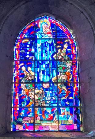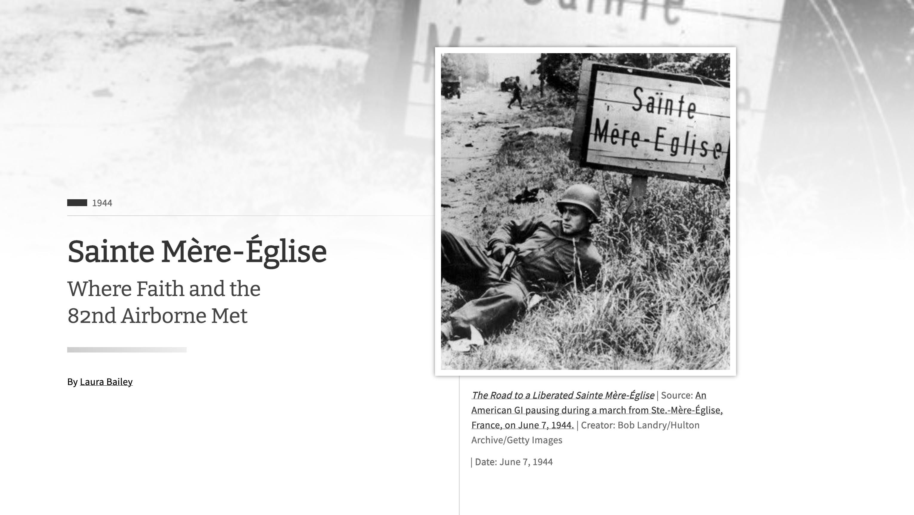 The stained glass window in the Church of Sainte Mére-Église, a small village in Normandy, France, honors the members of the 82nd Airborne Division that liberated the village during the Allied D-Day landings of June, 1944. The World War II Monuments site documents how the war is remembered and memorialized throughout the world.