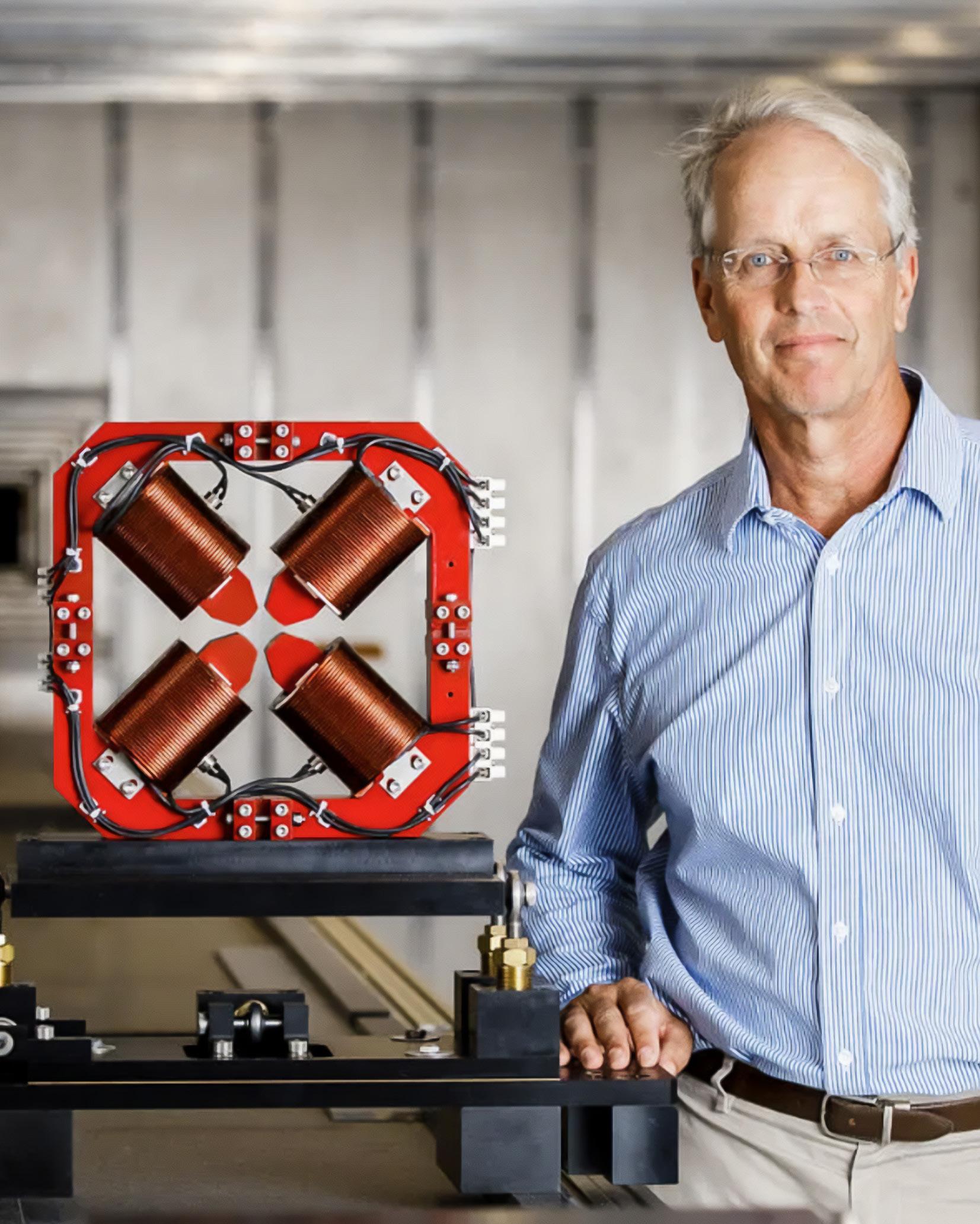 William Graves, chief scientist on the ASU compact X-ray free electron laser project, poses next to a component of the newly commissioned, first-ofits-kind device.