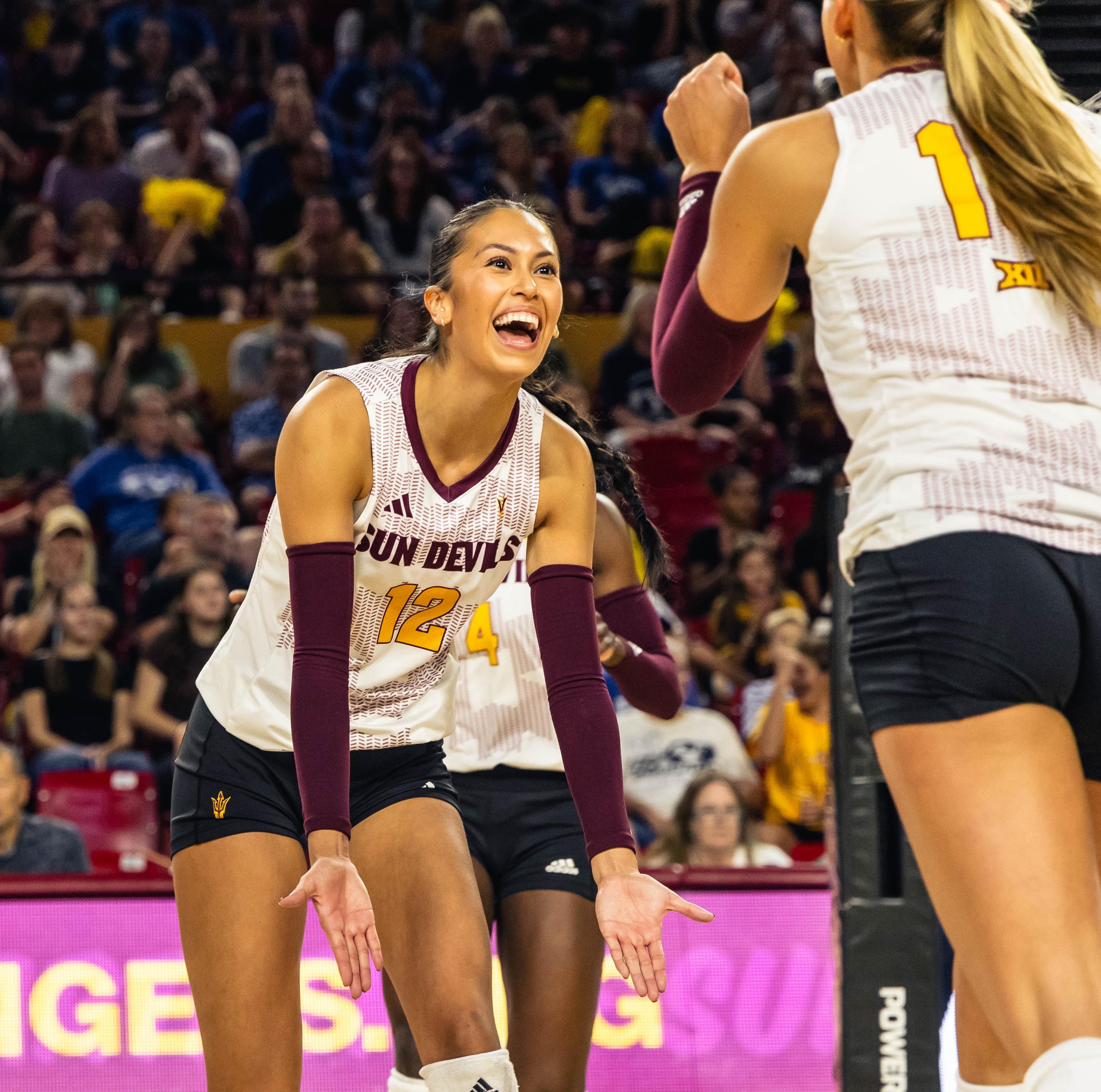 Sun Devil Volleyball setter Argentina Ung celebrates with a teammate. Sun Devil athletes pursue excellence on and off the court.